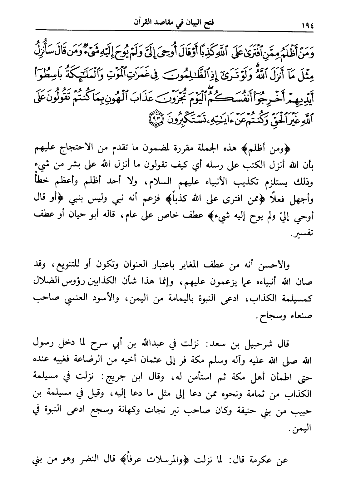 وَمَنْ أَظْلَمُ مِمَّنِ افْتَرَى عَلَى اللَّهِ كَذِبًا أَوْ قَالَ أُوحِيَ إِلَيَّ وَلَمْ يُوحَ إِلَيْهِ شَيْءٌ وَمَنْ قَالَ سَأُنْزِلُ مِثْلَ مَا أَنْزَلَ اللَّهُ وَلَوْ تَرَى إِذِ الظَّالِمُونَ فِي غَمَرَاتِ الْمَوْتِ وَالْمَلَائِكَةُ بَاسِطُو أَيْدِيهِمْ أَخْرِجُوا أَنْفُسَكُمُ الْيَوْمَ تُجْزَوْنَ عَذَابَ الْهُونِ بِمَا كُنْتُمْ تَقُولُونَ عَلَى اللَّهِ غَيْرَ الْحَقِّ وَكُنْتُمْ عَنْ آيَاتِهِ تَسْتَكْبِرُونَ (93)