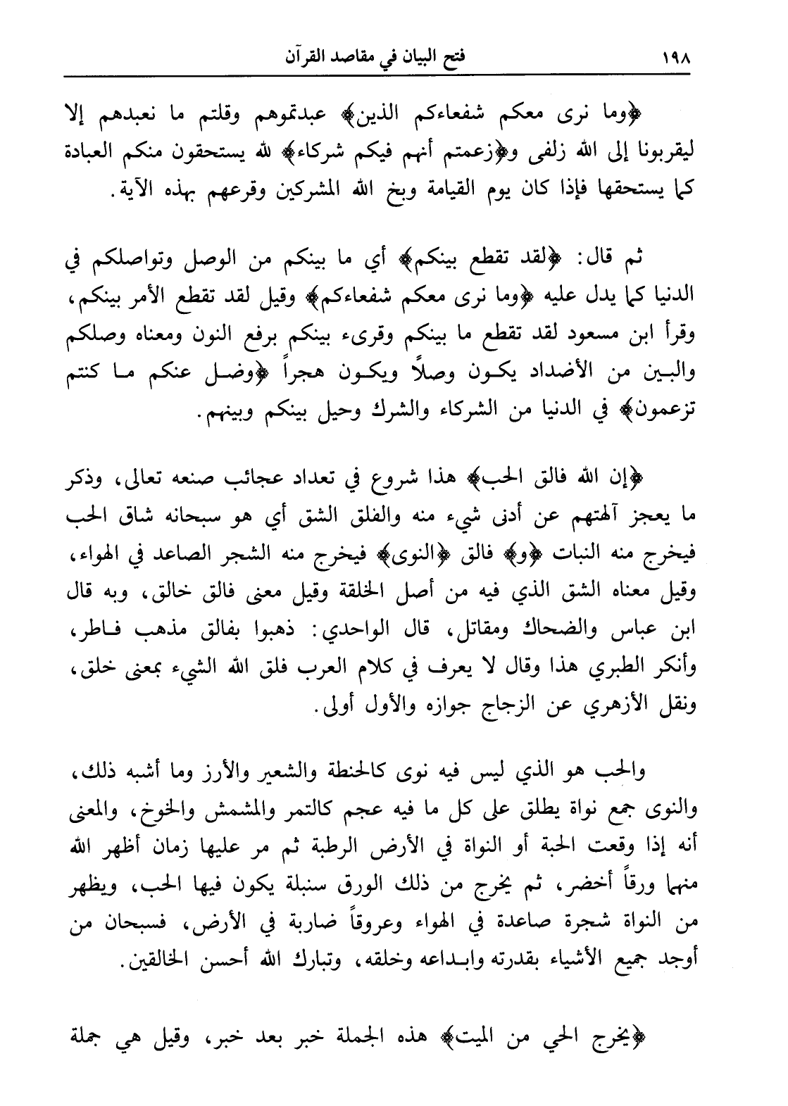 والحب هو الذي ليس فيه نوى كالحنطة والشعير والأرز وما أشبه ذلك، والنوى جمع نواة يطلق على كل ما فيه عجم كالتمر والمشمش والخوخ، والمعنى أنه إذا وقعت الحبة أو النواة في الأرض الرطبة ثم مر عليها زمان أظهر الله منهما ورقاً أخضر، ثم يخرج من ذلك الورق سنبلة يكون فيها الحب، ويظهر من النواة شجرة صاعدة في الهواء وعروقاً ضاربة في الأرض، فسبحان من أوجد جميع الأشياء بقدرته وإبداعه وخلقه، وتبارك الله أحسن الخالقين.