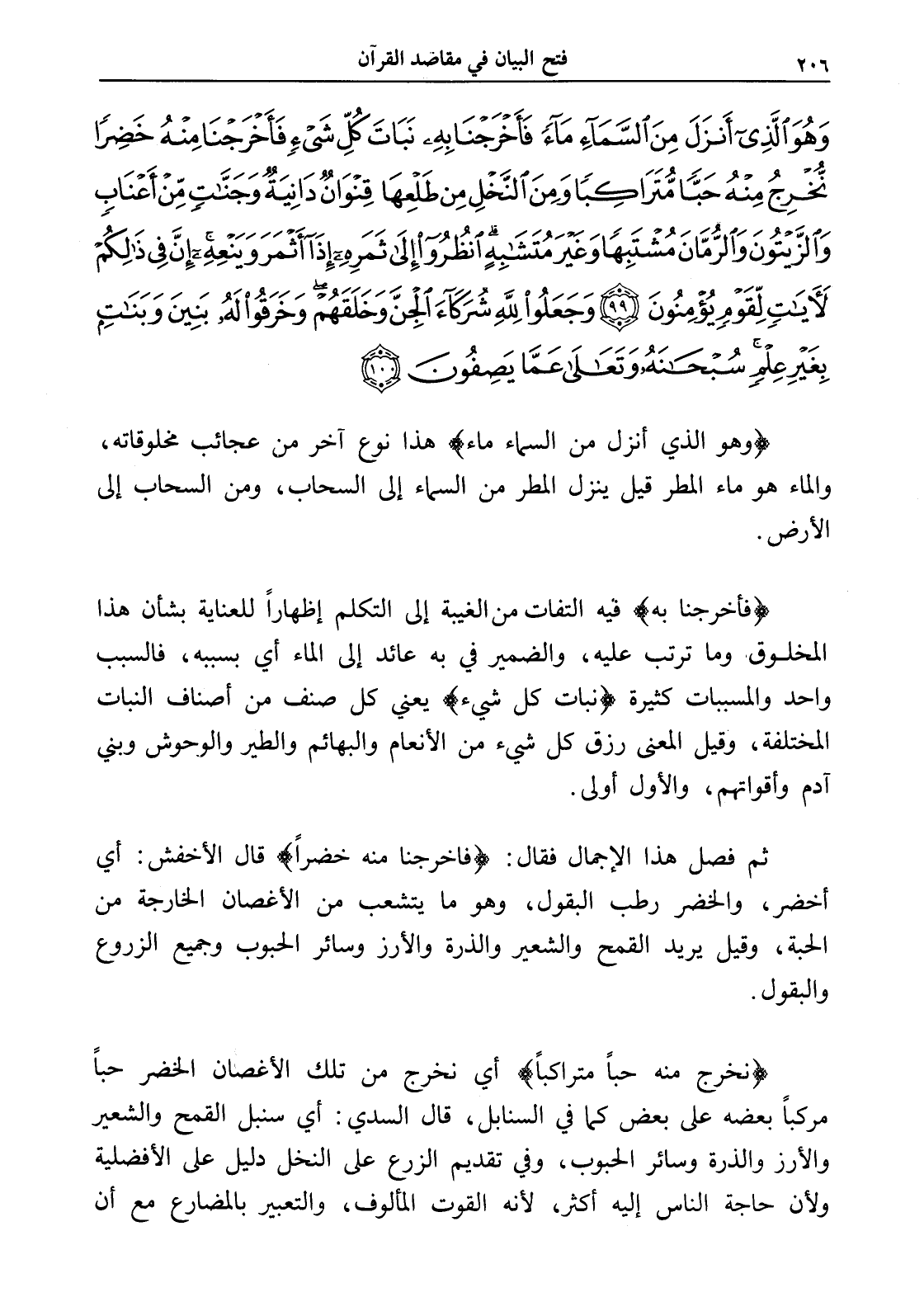 وَهُوَ الَّذِي أَنْزَلَ مِنَ السَّمَاءِ مَاءً فَأَخْرَجْنَا بِهِ نَبَاتَ كُلِّ شَيْءٍ فَأَخْرَجْنَا مِنْهُ خَضِرًا نُخْرِجُ مِنْهُ حَبًّا مُتَرَاكِبًا وَمِنَ النَّخْلِ مِنْ طَلْعِهَا قِنْوَانٌ دَانِيَةٌ وَجَنَّاتٍ مِنْ أَعْنَابٍ وَالزَّيْتُونَ وَالرُّمَّانَ مُشْتَبِهًا وَغَيْرَ مُتَشَابِهٍ انْظُرُوا إِلَى ثَمَرِهِ إِذَا أَثْمَرَ وَيَنْعِهِ إِنَّ فِي ذَلِكُمْ لَآيَاتٍ لِقَوْمٍ يُؤْمِنُونَ (99) وَجَعَلُوا لِلَّهِ شُرَكَاءَ الْجِنَّ وَخَلَقَهُمْ وَخَرَقُوا لَهُ بَنِينَ وَبَنَاتٍ بِغَيْرِ عِلْمٍ سُبْحَانَهُ وَتَعَالَى عَمَّا يَصِفُونَ (100)