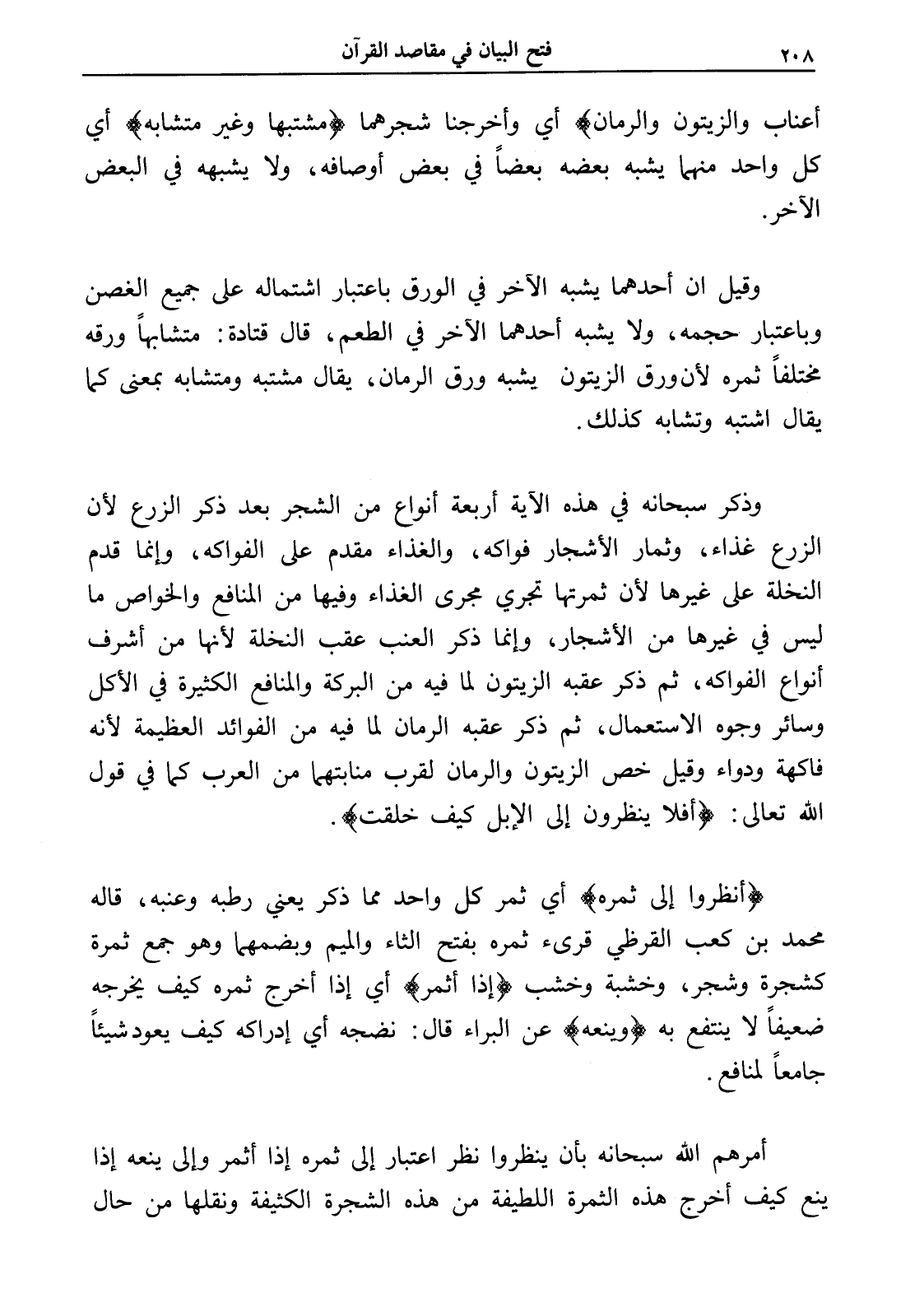 (أنظروا إلى ثمره) أي ثمر كل واحد مما ذكر يعني رطبه وعنبه، قاله محمد بن كعب القرظي قرئ ثمره بفتح الثاء والميم وبضمهما وهو جمع ثمرة كشجرة وشجر، وخشبة وخشب (إذا أثمر) أي إذا أخرج ثمره كيف يخرجه ضعيفاً لا ينتفع به (وينعه) عن البراء قال: نضجه أي إدراكه كيف يعود شيئاً جامعاً لمنافع.