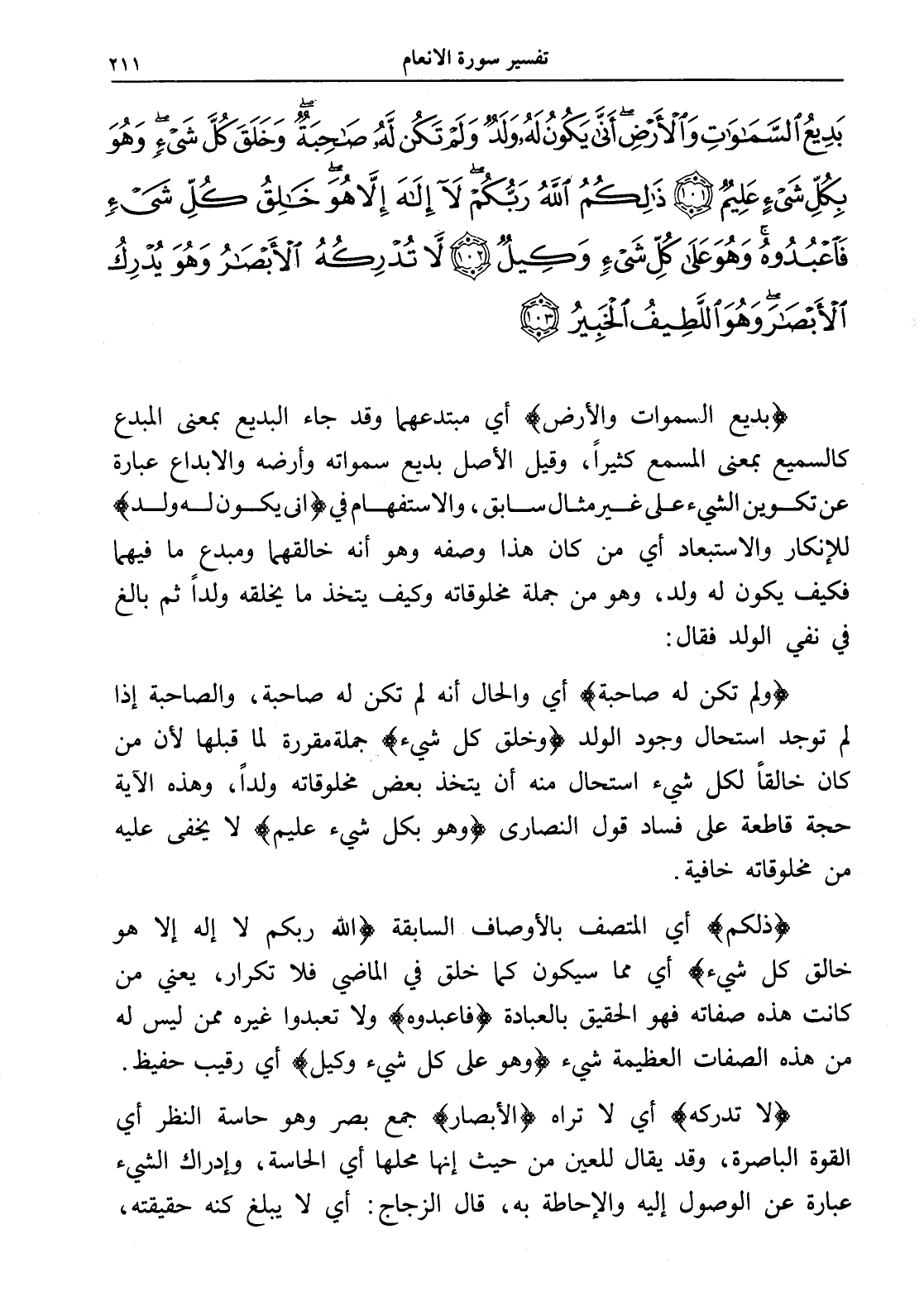 بَدِيعُ السَّمَاوَاتِ وَالْأَرْضِ أَنَّى يَكُونُ لَهُ وَلَدٌ وَلَمْ تَكُنْ لَهُ صَاحِبَةٌ وَخَلَقَ كُلَّ شَيْءٍ وَهُوَ بِكُلِّ شَيْءٍ عَلِيمٌ (101) ذَلِكُمُ اللَّهُ رَبُّكُمْ لَا إِلَهَ إِلَّا هُوَ خَالِقُ كُلِّ شَيْءٍ فَاعْبُدُوهُ وَهُوَ عَلَى كُلِّ شَيْءٍ وَكِيلٌ (102) لَا تُدْرِكُهُ الْأَبْصَارُ وَهُوَ يُدْرِكُ الْأَبْصَارَ وَهُوَ اللَّطِيفُ الْخَبِيرُ (103)