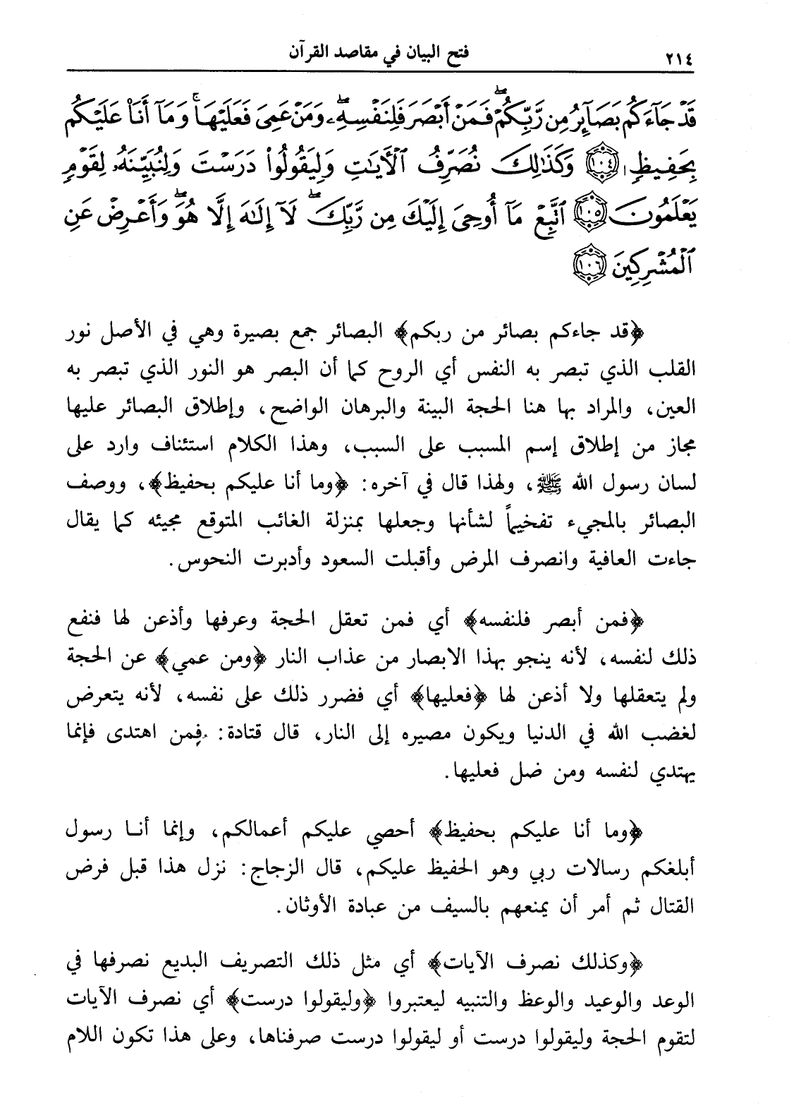 قَدْ جَاءَكُمْ بَصَائِرُ مِنْ رَبِّكُمْ فَمَنْ أَبْصَرَ فَلِنَفْسِهِ وَمَنْ عَمِيَ فَعَلَيْهَا وَمَا أَنَا عَلَيْكُمْ بِحَفِيظٍ (104) وَكَذَلِكَ نُصَرِّفُ الْآيَاتِ وَلِيَقُولُوا دَرَسْتَ وَلِنُبَيِّنَهُ لِقَوْمٍ يَعْلَمُونَ (105) اتَّبِعْ مَا أُوحِيَ إِلَيْكَ مِنْ رَبِّكَ لَا إِلَهَ إِلَّا هُوَ وَأَعْرِضْ عَنِ الْمُشْرِكِينَ (106)