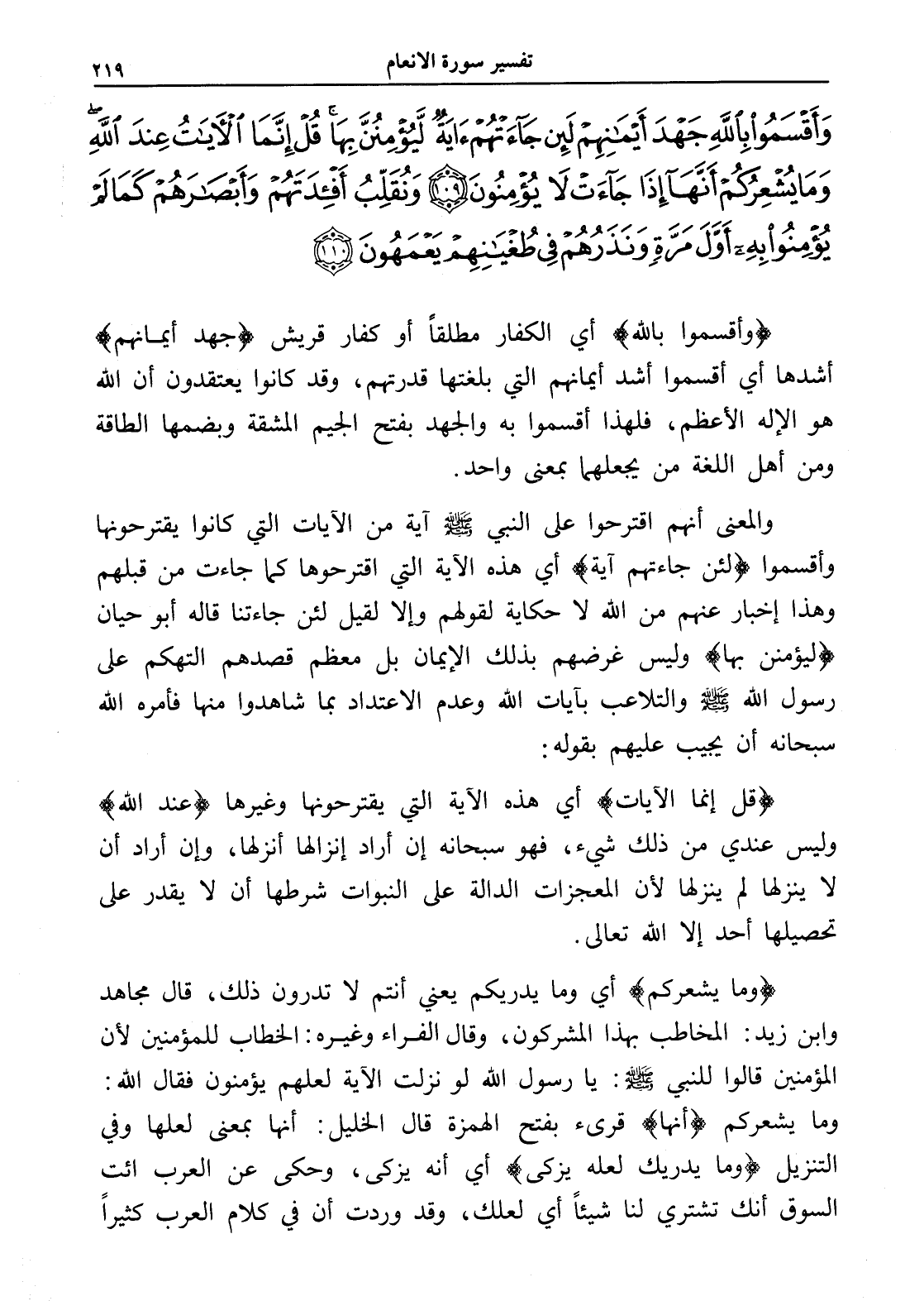 وَأَقْسَمُوا بِاللَّهِ جَهْدَ أَيْمَانِهِمْ لَئِنْ جَاءَتْهُمْ آيَةٌ لَيُؤْمِنُنَّ بِهَا قُلْ إِنَّمَا الْآيَاتُ عِنْدَ اللَّهِ وَمَا يُشْعِرُكُمْ أَنَّهَا إِذَا جَاءَتْ لَا يُؤْمِنُونَ (109) وَنُقَلِّبُ أَفْئِدَتَهُمْ وَأَبْصَارَهُمْ كَمَا لَمْ يُؤْمِنُوا بِهِ أَوَّلَ مَرَّةٍ وَنَذَرُهُمْ فِي طُغْيَانِهِمْ يَعْمَهُونَ (110)