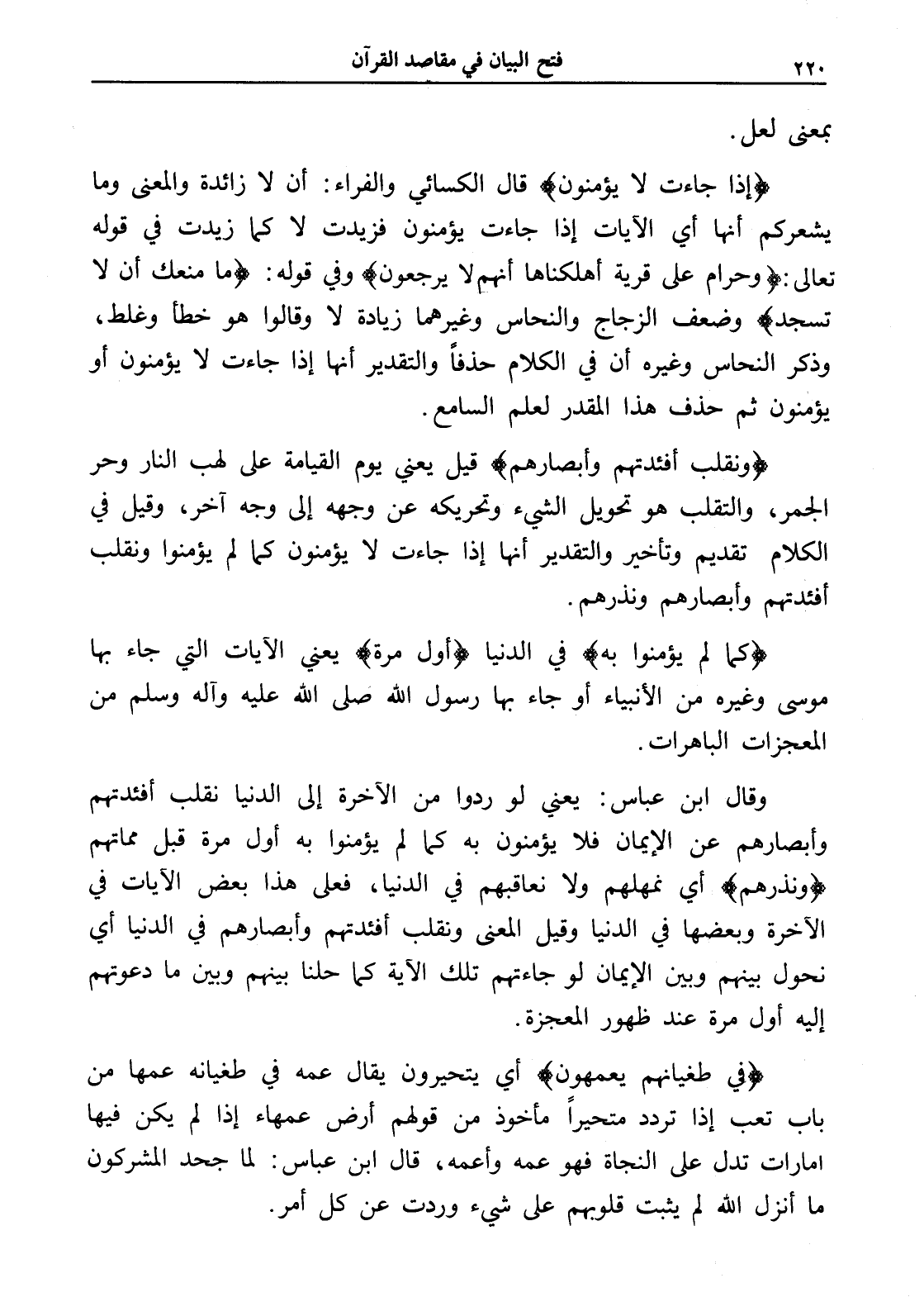 (في طغيانهم يعمهون) أي يتحيرون يقال عمه في طغيانه عمها من باب تعب إذا تردد متحيراً مأخوذ من قولهم أرض عمهاء إذا لم يكن فيها أمارات تدل على النجاة فهو عمه وأعمه، قال ابن عباس: لما جحد المشركون ما أنزل الله لم يثبت قلوبهم على شيء وردت عن كل أمر.