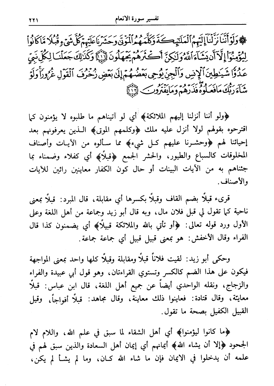 وَلَوْ أَنَّنَا نَزَّلْنَا إِلَيْهِمُ الْمَلَائِكَةَ وَكَلَّمَهُمُ الْمَوْتَى وَحَشَرْنَا عَلَيْهِمْ كُلَّ شَيْءٍ قُبُلاً مَا كَانُوا لِيُؤْمِنُوا إِلَّا أَنْ يَشَاءَ اللَّهُ وَلَكِنَّ أَكْثَرَهُمْ يَجْهَلُونَ (111) وَكَذَلِكَ جَعَلْنَا لِكُلِّ نَبِيٍّ عَدُوًّا شَيَاطِينَ الْإِنْسِ وَالْجِنِّ يُوحِي بَعْضُهُمْ إِلَى بَعْضٍ زُخْرُفَ الْقَوْلِ غُرُورًا وَلَوْ شَاءَ رَبُّكَ مَا فَعَلُوهُ فَذَرْهُمْ وَمَا يَفْتَرُونَ (112)