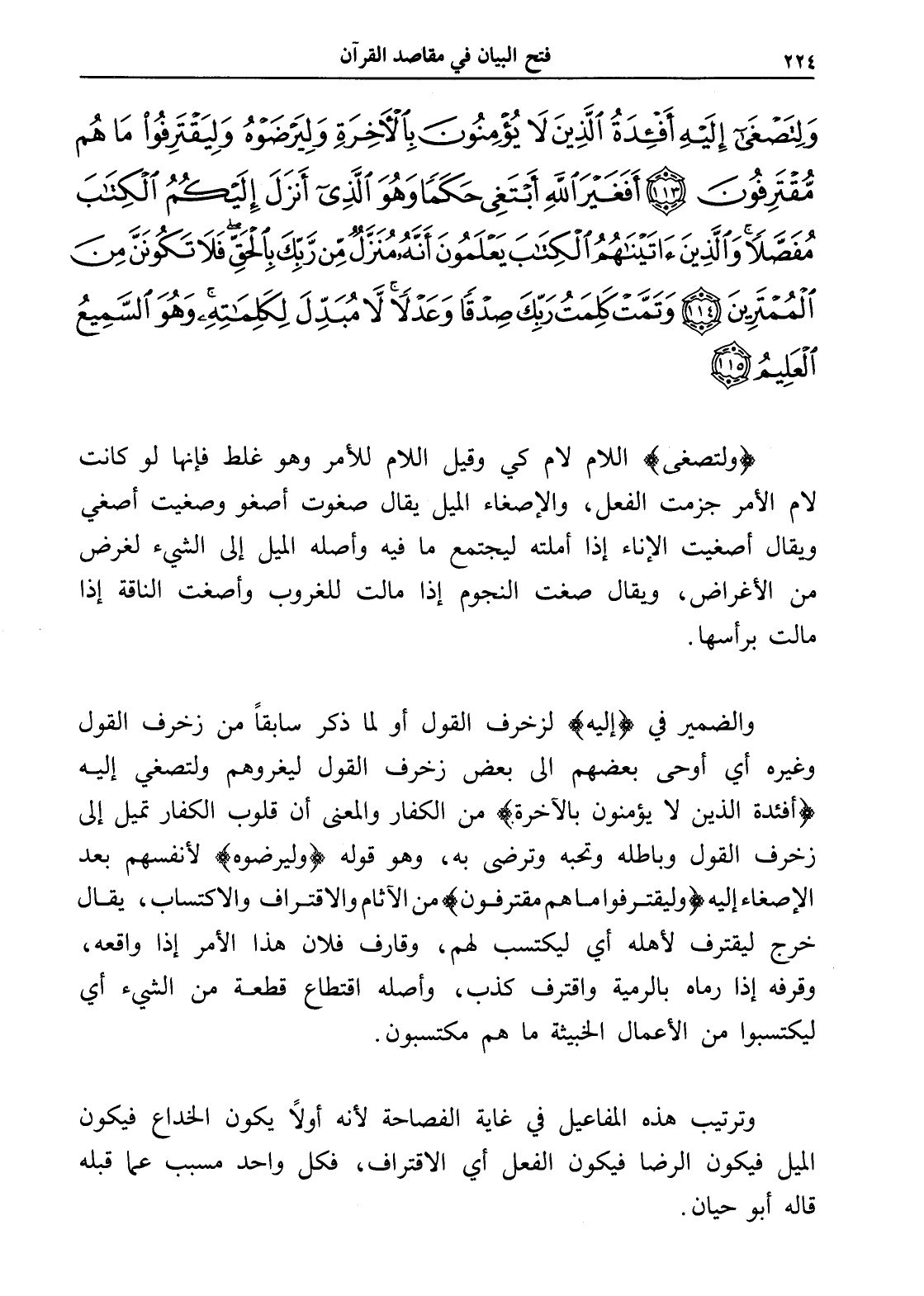 وَلِتَصْغَى إِلَيْهِ أَفْئِدَةُ الَّذِينَ لَا يُؤْمِنُونَ بِالْآخِرَةِ وَلِيَرْضَوْهُ وَلِيَقْتَرِفُوا مَا هُمْ مُقْتَرِفُونَ (113) أَفَغَيْرَ اللَّهِ أَبْتَغِي حَكَمًا وَهُوَ الَّذِي أَنْزَلَ إِلَيْكُمُ الْكِتَابَ مُفَصَّلاً وَالَّذِينَ آتَيْنَاهُمُ الْكِتَابَ يَعْلَمُونَ أَنَّهُ مُنَزَّلٌ مِنْ رَبِّكَ بِالْحَقِّ فَلَا تَكُونَنَّ مِنَ الْمُمْتَرِينَ (114) وَتَمَّتْ كَلِمَتُ رَبِّكَ صِدْقًا وَعَدْلاً لَا مُبَدِّلَ لِكَلِمَاتِهِ وَهُوَ السَّمِيعُ الْعَلِيمُ (115)