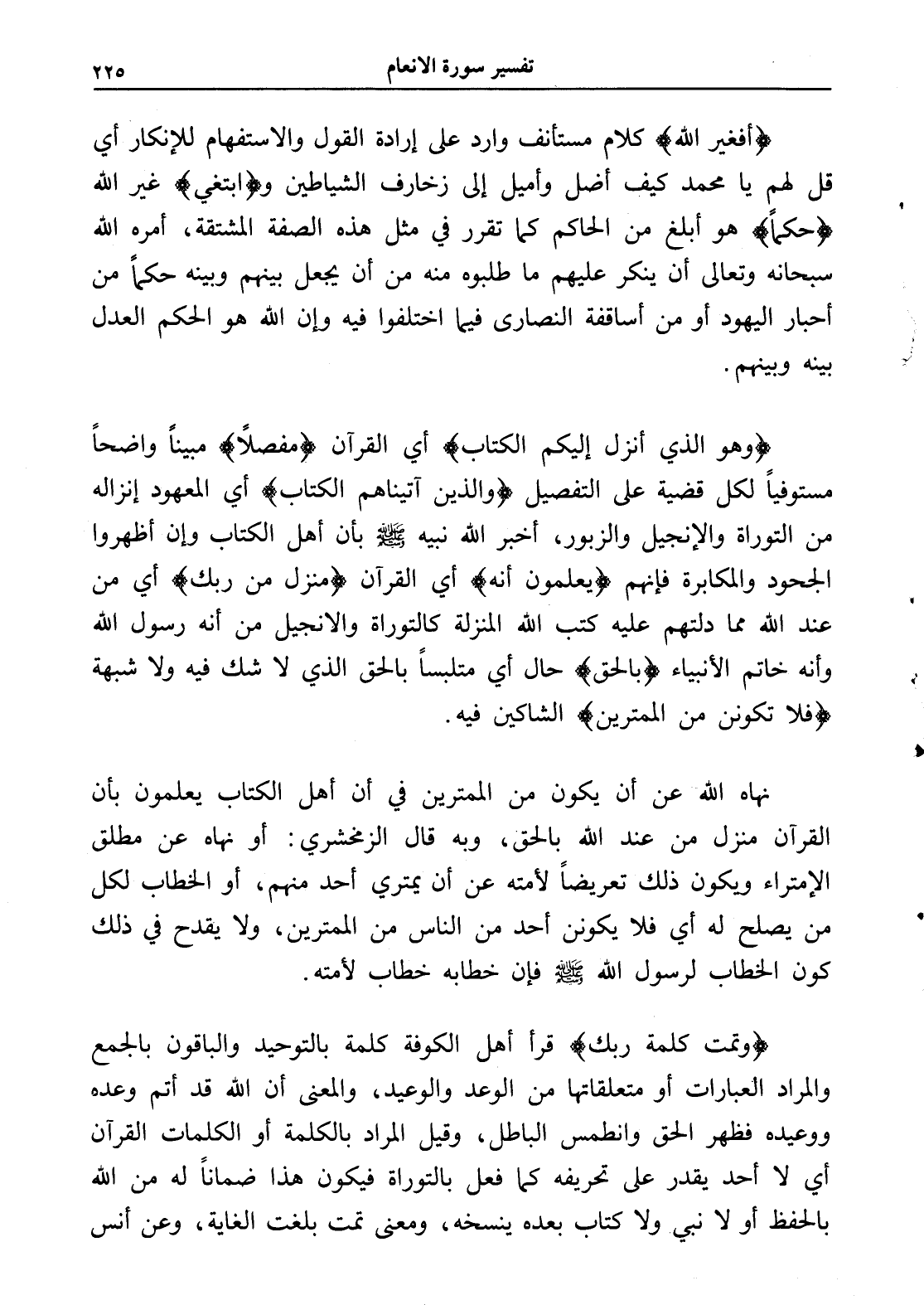 (أفغير الله) كلام مستأنف وارد على إرادة القول والاستفهام للإنكار أي قل لهم يا محمد كيف أضل وأميل إلى زخارف الشياطين و (ابتغي) غير الله حكماً هو أبلغ من الحاكم كما تقرر في مثل هذه الصفة المشتقة، أمره الله سبحانه وتعالى أن ينكر عليهم ما طلبوه منه من أن يجعل بينهم وبينه حكماً من أحبار اليهود أو من أساقفة النصارى فيما اختلفوا فيه وإن الله هو الحكم العدل بينه وبينهم.