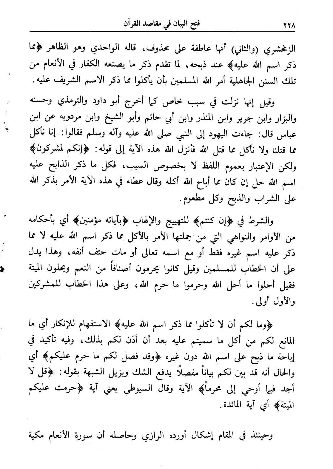 وقيل إنها نزلت في سبب خاص كما أخرج أبو داود والترمذي وحسنه والبزار وابن جرير وابن المنذر وابن أبي حاتم وأبو الشيخ وابن مردويه عن ابن عباس قال: جاءت اليهود إلى النبي صلى الله عليه وآله وسلم فقالوا: إنا نأكل مما قتلنا ولا نأكل مما قتل الله فأنزل الله هذه الآية إلى قوله: (إنكم لمشركون) ولكن الإعتبار بعموم اللفظ لا بخصوص السبب، فكل ما ذكر الذابح عليه اسم الله حل إن كان مما أباح الله أكله وقال عطاء في هذه الآية الأمر بذكر الله على الشراب والذبح وكل مطعوم.