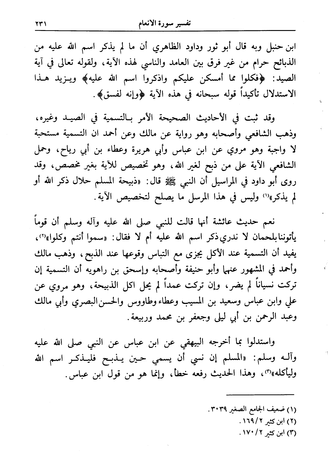 ابن حنبل وبه قال أبو ثور وداود الظاهري أن ما لم يذكر اسم الله عليه من الذبائح حرام من غير فرق بين العامد والناسي لهذه الآية، ولقوله تعالى في آية الصيد: (فكلوا مما أمسكن عليكم واذكروا اسم الله عليه) ويزيد هذا الاستدلال تأكيداً قوله سبحانه في هذه الآية (وإنه لفسق).