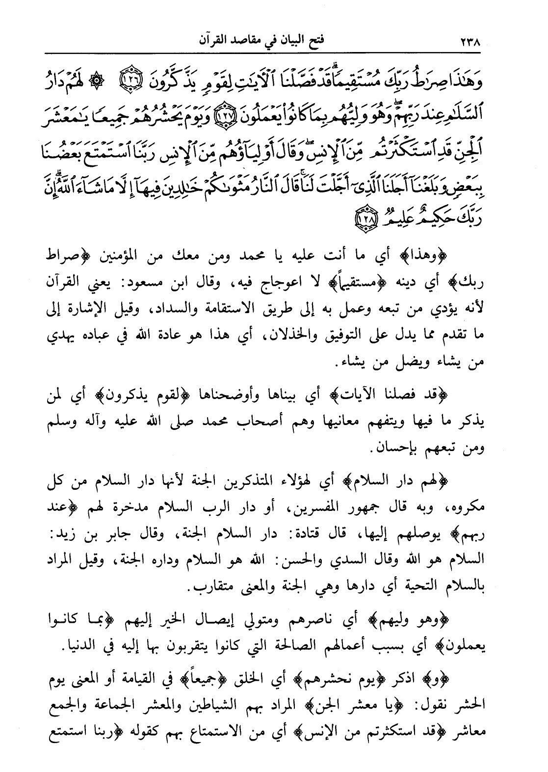 وَهَذَا صِرَاطُ رَبِّكَ مُسْتَقِيمًا قَدْ فَصَّلْنَا الْآيَاتِ لِقَوْمٍ يَذَّكَّرُونَ (126) لَهُمْ دَارُ السَّلَامِ عِنْدَ رَبِّهِمْ وَهُوَ وَلِيُّهُمْ بِمَا كَانُوا يَعْمَلُونَ (127) وَيَوْمَ يَحْشُرُهُمْ جَمِيعًا يَا مَعْشَرَ الْجِنِّ قَدِ اسْتَكْثَرْتُمْ مِنَ الْإِنْسِ وَقَالَ أَوْلِيَاؤُهُمْ مِنَ الْإِنْسِ رَبَّنَا اسْتَمْتَعَ بَعْضُنَا بِبَعْضٍ وَبَلَغْنَا أَجَلَنَا الَّذِي أَجَّلْتَ لَنَا قَالَ النَّارُ مَثْوَاكُمْ خَالِدِينَ فِيهَا إِلَّا مَا شَاءَ اللَّهُ إِنَّ رَبَّكَ حَكِيمٌ عَلِيمٌ (128)
