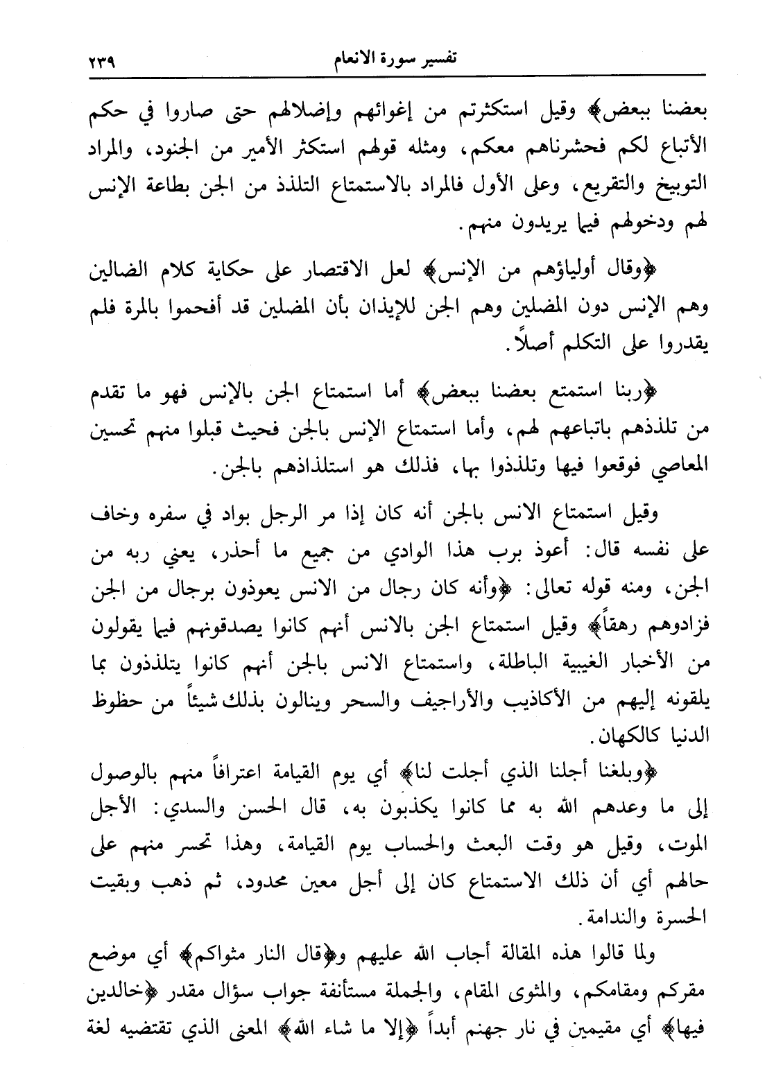 وقيل استمتاع الإنس بالجن أنه كان إذا مر الرجل بواد في سفره وخاف على نفسه قال: أعوذ برب هذا الوادي من جميع ما أحذر، يعني ربه من الجن، ومنه قوله تعالى: (وأنه كان رجال من الإنس يعوذون برجال من الجن فزادوهم رهقاً) وقيل استمتاع الجن بالإنس أنهم كانوا يصدقونهم فيما يقولون من الأخبار الغيبية الباطلة، واستمتاع الإنس بالجن أنهم كانوا يتلذذون بما يلقونه إليهم من الأكاذيب والأراجيف والسحر وينالون بذلك شيئاً من حظوظ الدنيا كالكهان.