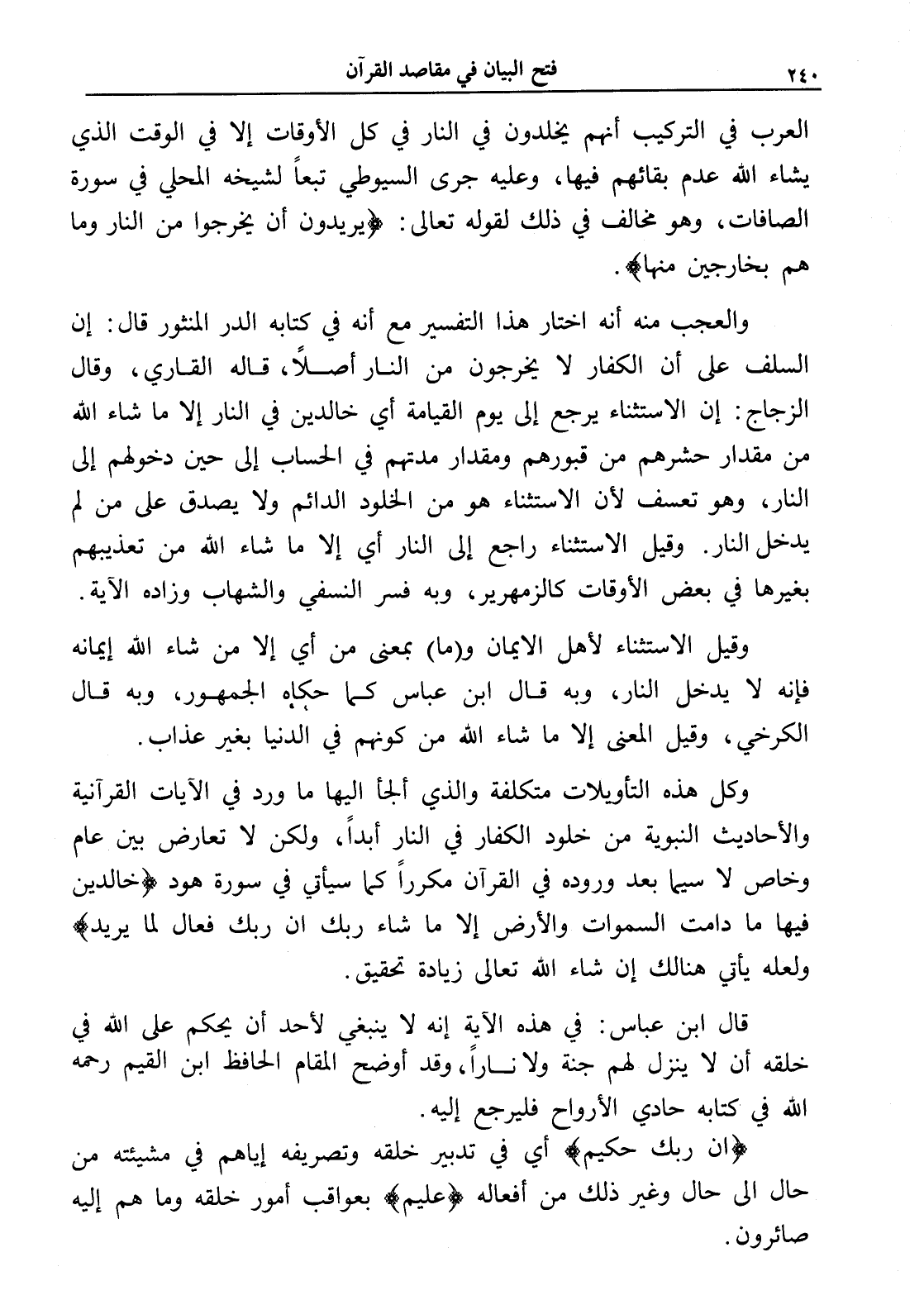 العرب في التركيب أنهم يخلدون في النار في كل الأوقات إلا في الوقت الذي يشاء الله عدم بقائهم فيها، وعليه جرى السيوطي تبعاً لشيخه المحلي في سورة الصافات، وهو مخالف في ذلك لقوله تعالى: (يريدون أن يخرجوا من النار وما هم بخارجين منها).