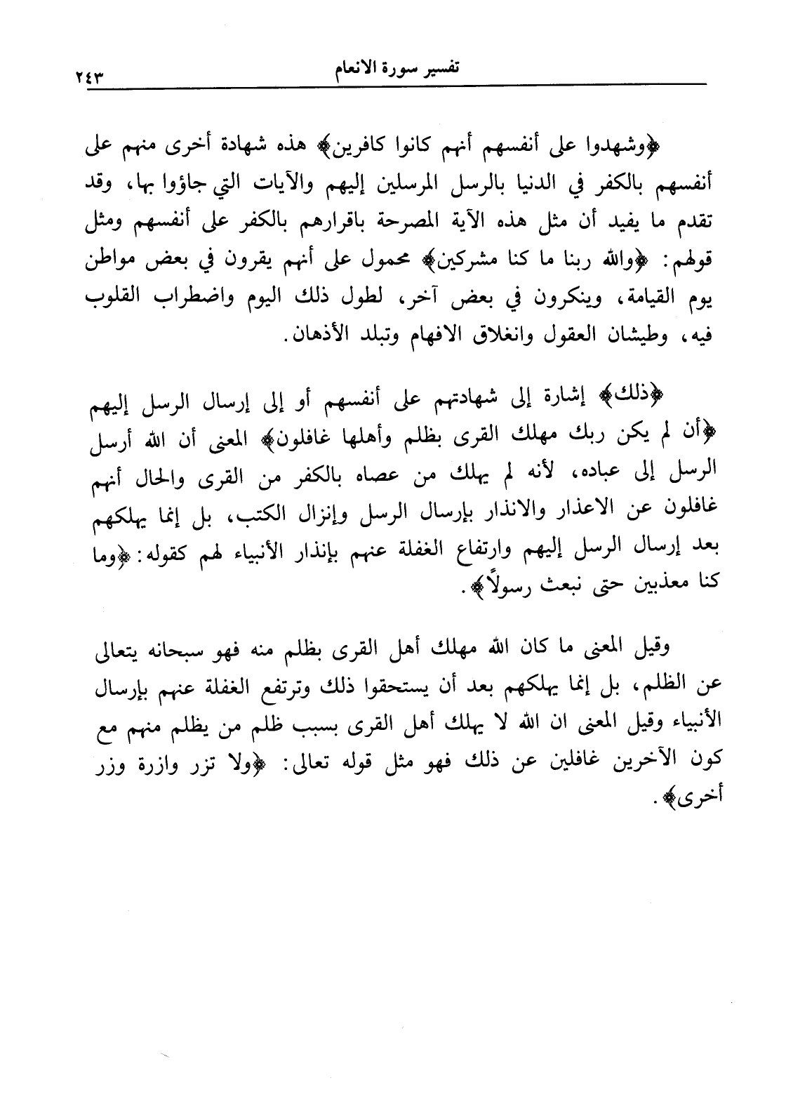 (ذلك) إشارة إلى شهادتهم على أنفسهم أو إلى إرسال الرسل إليهم (أن لم يكن ربك مهلك القرى بظلم وأهلها غافلون) المعنى أن الله أرسل الرسل إلى عباده، لأنه لم يهلك من عصاه بالكفر من القرى والحال أنهم غافلون عن الأعذار والإنذار بإرسال الرسل وإنزال الكتب، بل إنما يهلكهم بعد إرسال الرسل إليهم وارتفاع الغفلة عنهم بإنذار الأنبياء لهم كقوله: (وما كنا معذبين حتى نبعث رسولاً).