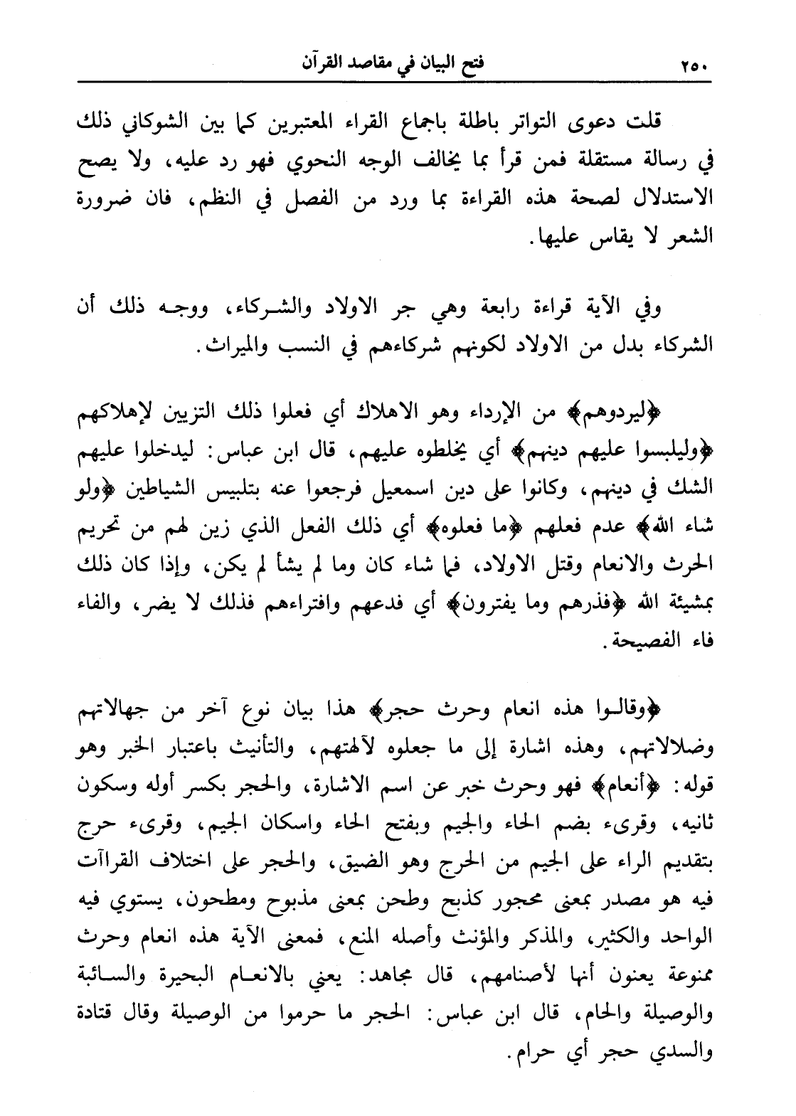 قلت دعوى التواتر باطلة بإجماع القراء المعتبرين كما بين الشوكاني ذلك في رسالة مستقلة فمن قرأ بما يخالف الوجه النحوي فهو رد عليه، ولا يصح الاستدلال لصحة هذه القراءة بما ورد من الفصل في النظم، فإن ضرورة الشعر لا يقاس عليها.