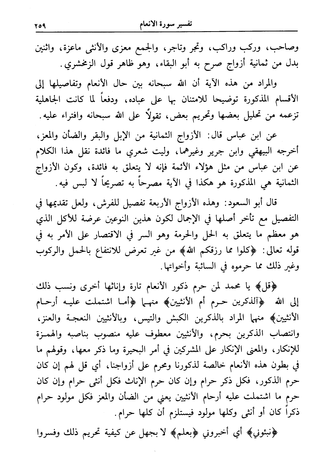 عن ابن عباس قال: الأزواج الثمانية من الإبل والبقر والضأن والمعز، أخرجه البيهقي وابن جرير وغيرهما، وليت شعري ما فائدة نقل هذا الكلام عن ابن عباس من مثل هؤلاء الأئمة فإنه لا يتعلق به فائدة، وكون الأزواج الثمانية هي المذكورة هو هكذا في الآية مصرحاً به تصريحاً لا لبس فيه.