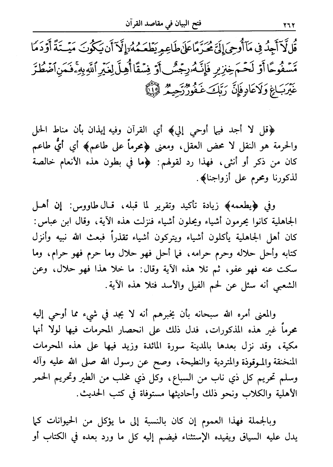 قُلْ لَا أَجِدُ فِي مَا أُوحِيَ إِلَيَّ مُحَرَّمًا عَلَى طَاعِمٍ يَطْعَمُهُ إِلَّا أَنْ يَكُونَ مَيْتَةً أَوْ دَمًا مَسْفُوحًا أَوْ لَحْمَ خِنْزِيرٍ فَإِنَّهُ رِجْسٌ أَوْ فِسْقًا أُهِلَّ لِغَيْرِ اللَّهِ بِهِ فَمَنِ اضْطُرَّ غَيْرَ بَاغٍ وَلَا عَادٍ فَإِنَّ رَبَّكَ غَفُورٌ رَحِيمٌ (145)
