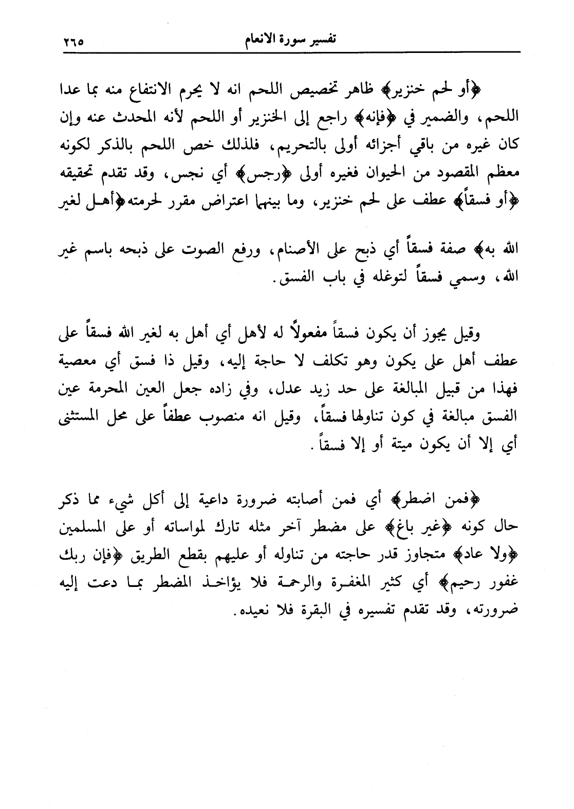 (أو لحم خنزير) ظاهر تخصيص اللحم أنه لا يحرم الانتفاع منه بما عدا اللحم، والضمير في (فإنه) راجع إلى الخنزير أو اللحم لأنه المحدث عنه وإن كان غيره من باقي أجزائه أولى بالتحريم، فلذلك خص اللحم بالذكر لكونه معظم المقصود من الحيوان فغيره أولى (رجس) أي نجس، وقد تقدم تحقيقه (أو فسقاً) عطف على لحم خنزير، وما بينهما اعتراض مقرر لحرمته (أهل لغير الله به) صفة فسقاً أي ذبح على الأصنام، ورفع الصوت على ذبحه باسم غير الله، وسمي فسقاً لتوغله في باب الفسق.