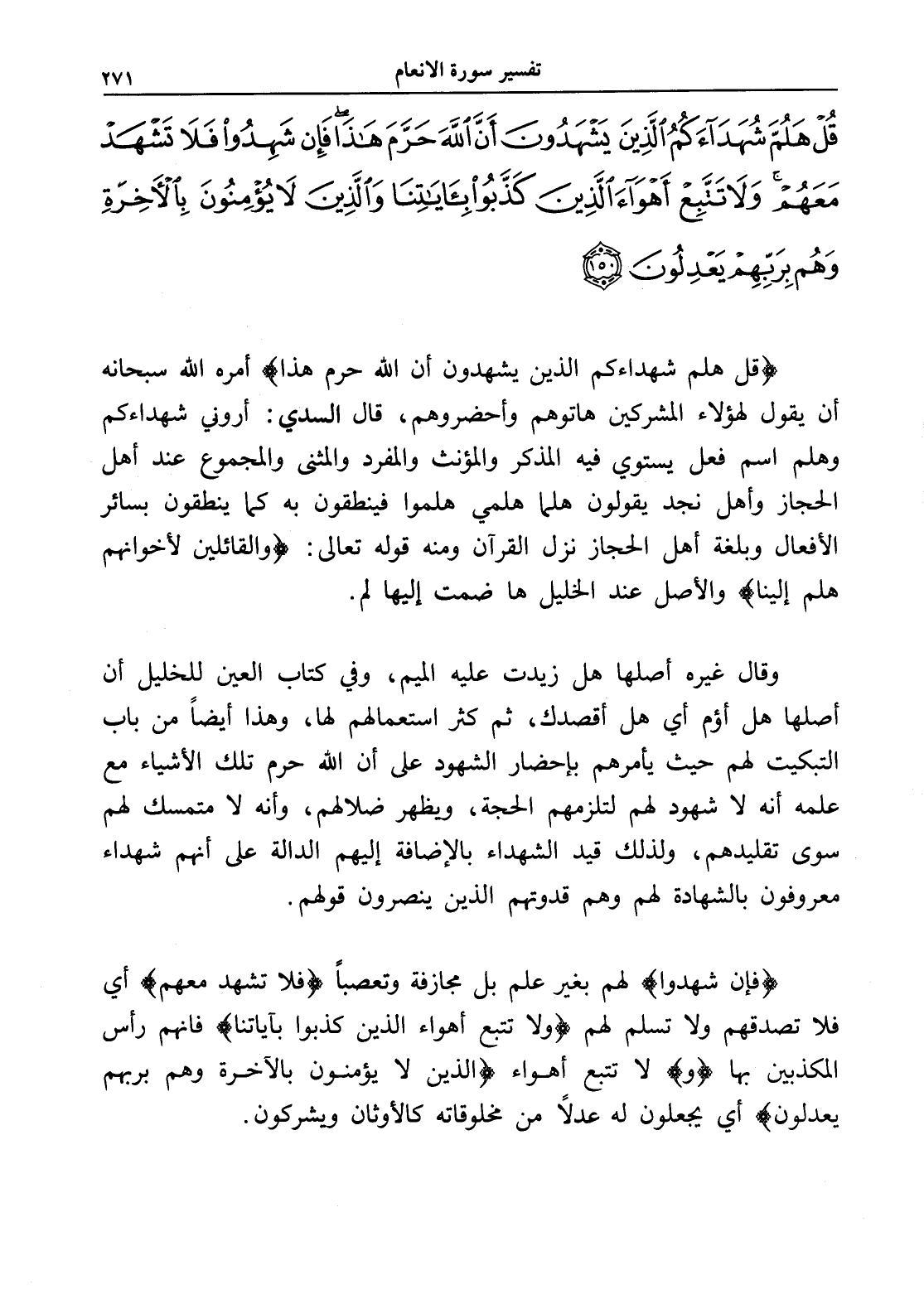قُلْ فَلِلَّهِ الْحُجَّةُ الْبَالِغَةُ فَلَوْ شَاءَ لَهَدَاكُمْ أَجْمَعِينَ (149) قُلْ هَلُمَّ شُهَدَاءَكُمُ الَّذِينَ يَشْهَدُونَ أَنَّ اللَّهَ حَرَّمَ هَذَا فَإِنْ شَهِدُوا فَلَا تَشْهَدْ مَعَهُمْ وَلَا تَتَّبِعْ أَهْوَاءَ الَّذِينَ كَذَّبُوا بِآيَاتِنَا وَالَّذِينَ لَا يُؤْمِنُونَ بِالْآخِرَةِ وَهُمْ بِرَبِّهِمْ يَعْدِلُونَ (150)
