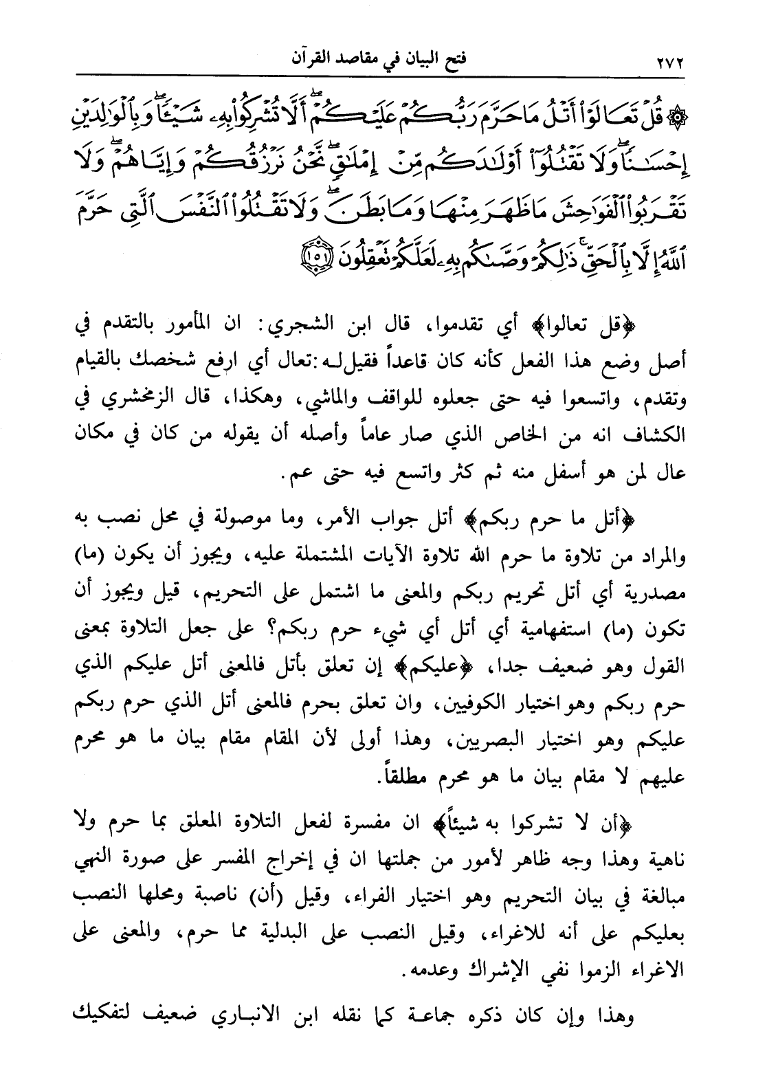 (أتل ما حرم ربكم) أتل جواب الأمر، وما موصولة في محل نصب به والمراد من تلاوة ما حرم الله تلاوة الآيات المشتملة عليه، ويجوز أن يكون (ما) مصدرية أي أتل تحريم ربكم والمعنى ما اشتمل على التحريم، قيل ويجوز أن تكون (ما) استفهامية أي أتل أي شيء حرم ربكم؟ على جعل التلاوة بمعنى القول وهو ضعيف جداً، (عليكم) إن تعلق بأتل فالمعنى أتل عليكم الذي حرم ربكم وهو اختيار الكوفيين، وإن تعلق بحرم فالمعنى أتل الذي حرم ربكم عليكم وهو اختيار البصريين، وهذا أولى لأن المقام مقام بيان ما هو محرم عليهم لا مقام بيان ما هو محرم مطلقاً.