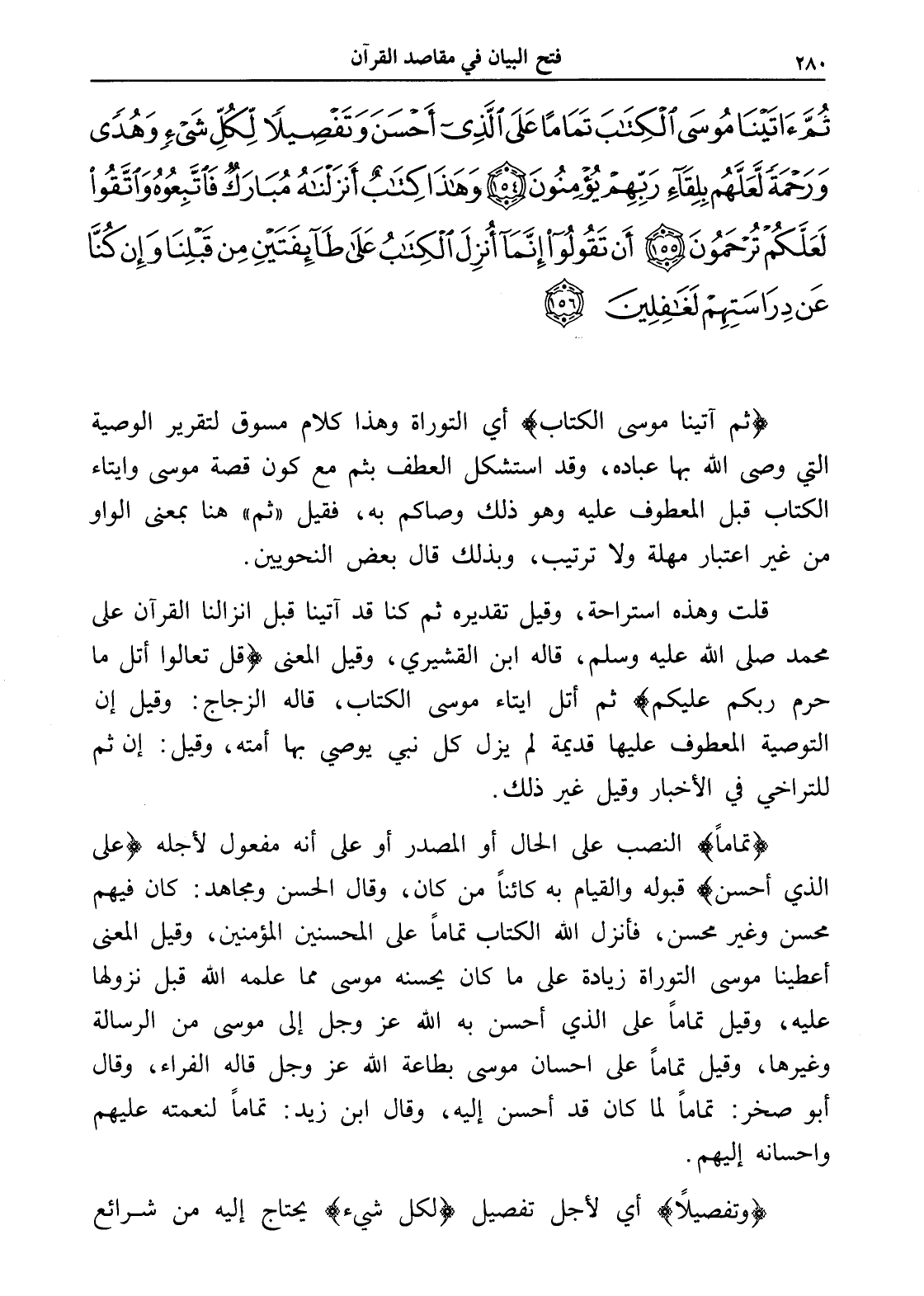 ثُمَّ آتَيْنَا مُوسَى الْكِتَابَ تَمَامًا عَلَى الَّذِي أَحْسَنَ وَتَفْصِيلاً لِكُلِّ شَيْءٍ وَهُدًى وَرَحْمَةً لَعَلَّهُمْ بِلِقَاءِ رَبِّهِمْ يُؤْمِنُونَ (154) وَهَذَا كِتَابٌ أَنْزَلْنَاهُ مُبَارَكٌ فَاتَّبِعُوهُ وَاتَّقُوا لَعَلَّكُمْ تُرْحَمُونَ (155) أَنْ تَقُولُوا إِنَّمَا أُنْزِلَ الْكِتَابُ عَلَى طَائِفَتَيْنِ مِنْ قَبْلِنَا وَإِنْ كُنَّا عَنْ دِرَاسَتِهِمْ لَغَافِلِينَ (156)