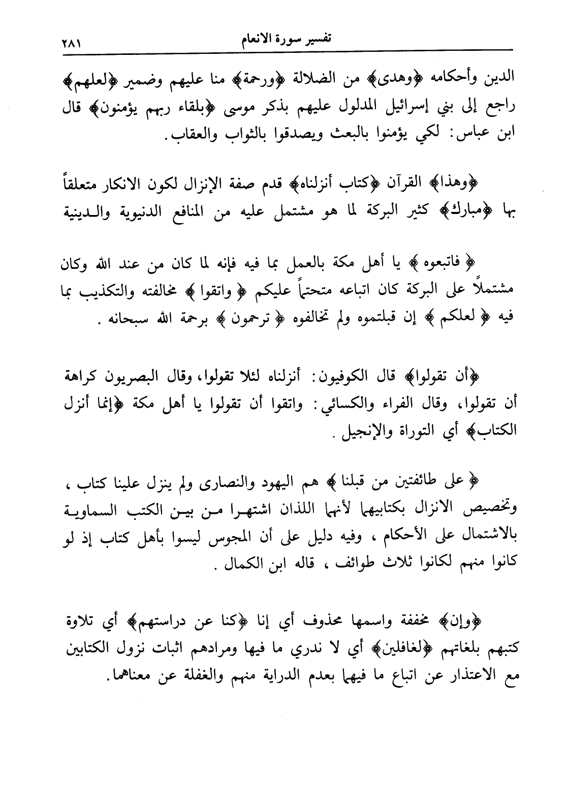 (أن تقولوا) قال الكوفيون: أنزلناه لئلا تقولوا، وقال البصريون كراهة أن تقولوا، وقال الفراء والكسائي: واتقوا أن تقولوا يا أهل مكة (إنما أنزل الكتاب) أي التوراة والإنجيل.