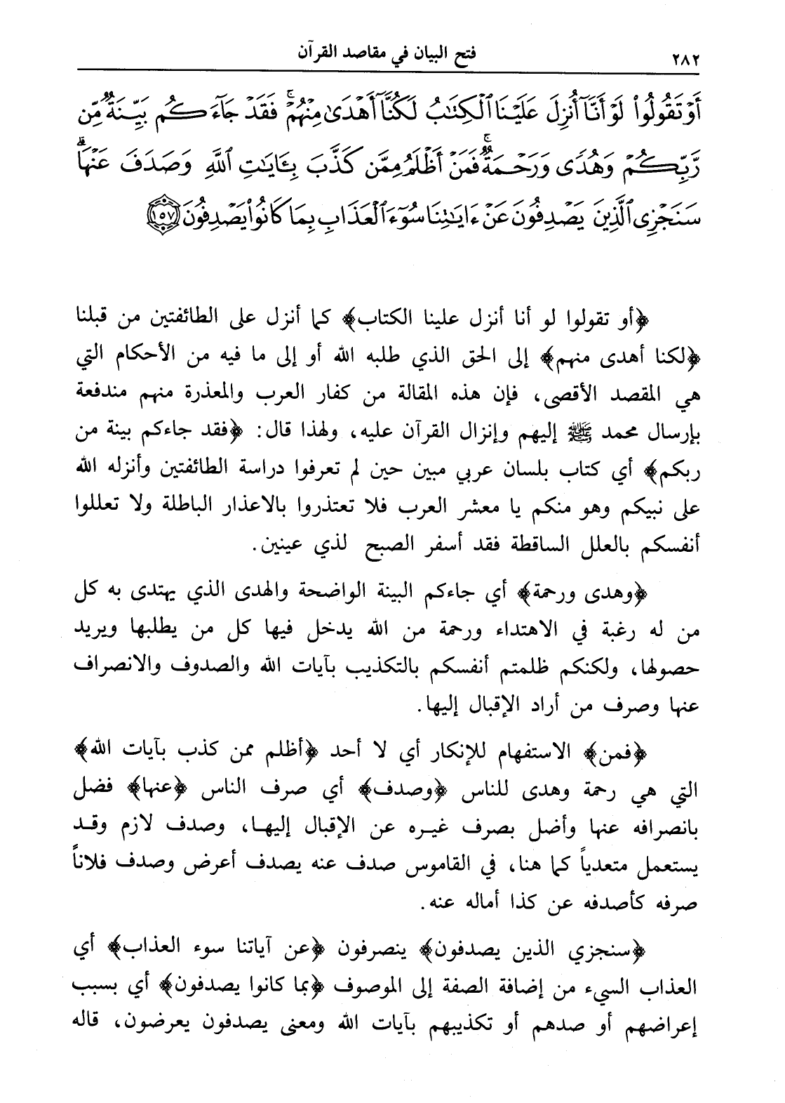 أَوْ تَقُولُوا لَوْ أَنَّا أُنْزِلَ عَلَيْنَا الْكِتَابُ لَكُنَّا أَهْدَى مِنْهُمْ فَقَدْ جَاءَكُمْ بَيِّنَةٌ مِنْ رَبِّكُمْ وَهُدًى وَرَحْمَةٌ فَمَنْ أَظْلَمُ مِمَّنْ كَذَّبَ بِآيَاتِ اللَّهِ وَصَدَفَ عَنْهَا سَنَجْزِي الَّذِينَ يَصْدِفُونَ عَنْ آيَاتِنَا سُوءَ الْعَذَابِ بِمَا كَانُوا يَصْدِفُونَ (157)