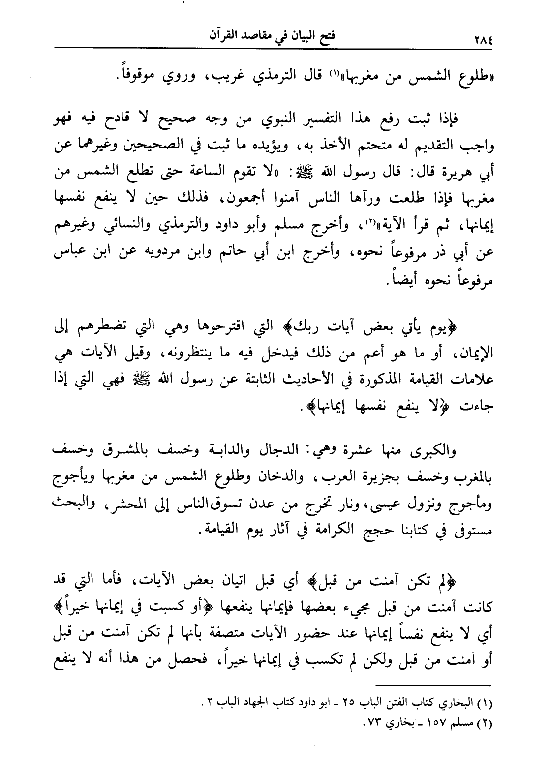 فإذا ثبت رفع هذا التفسير النبوي من وجه صحيح لا قادح فيه فهو واجب التقديم له متحتم الأخذ به، ويؤيده ما ثبت في الصحيحين وغيرهما عن أبي هريرة قال: قال رسول الله - صلى الله عليه وسلم -: " لا تقوم الساعة حتى تطلع الشمس من مغربها فإذا طلعت ورآها الناس آمنوا أجمعون، فذلك حين لا ينفع نفسها إيمانها، ثم قرأ الآية " (¬2)، وأخرج مسلم وأبو داود والترمذي والنسائي وغيرهم عن أبي ذر مرفوعاً نحوه، وأخرج ابن أبي حاتم وابن مردويه عن ابن عباس مرفوعاً نحوه أيضاً.