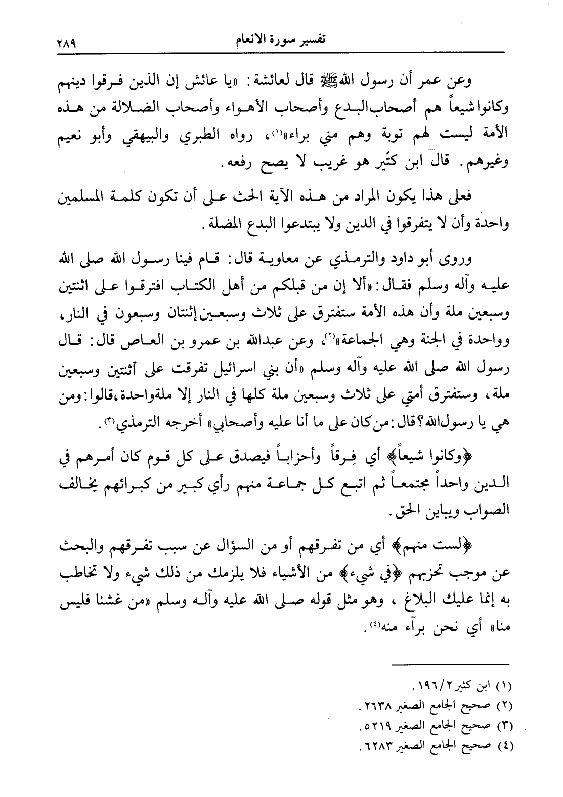 وعن عمر أن رسول الله - صلى الله عليه وسلم - قال لعائشة: " يا عائش إن الذين فرقوا دينهم وكانوا شيعاً هم أصحاب البدع وأصحاب الأهواء وأصحاب الضلالة من هذه الأمة ليست لهم توبة وهم مني براء " (¬1)، رواه الطبري والبيهقي وأبو نعيم وغيرهم. قال ابن كثير هو غريب لا يصح رفعه.