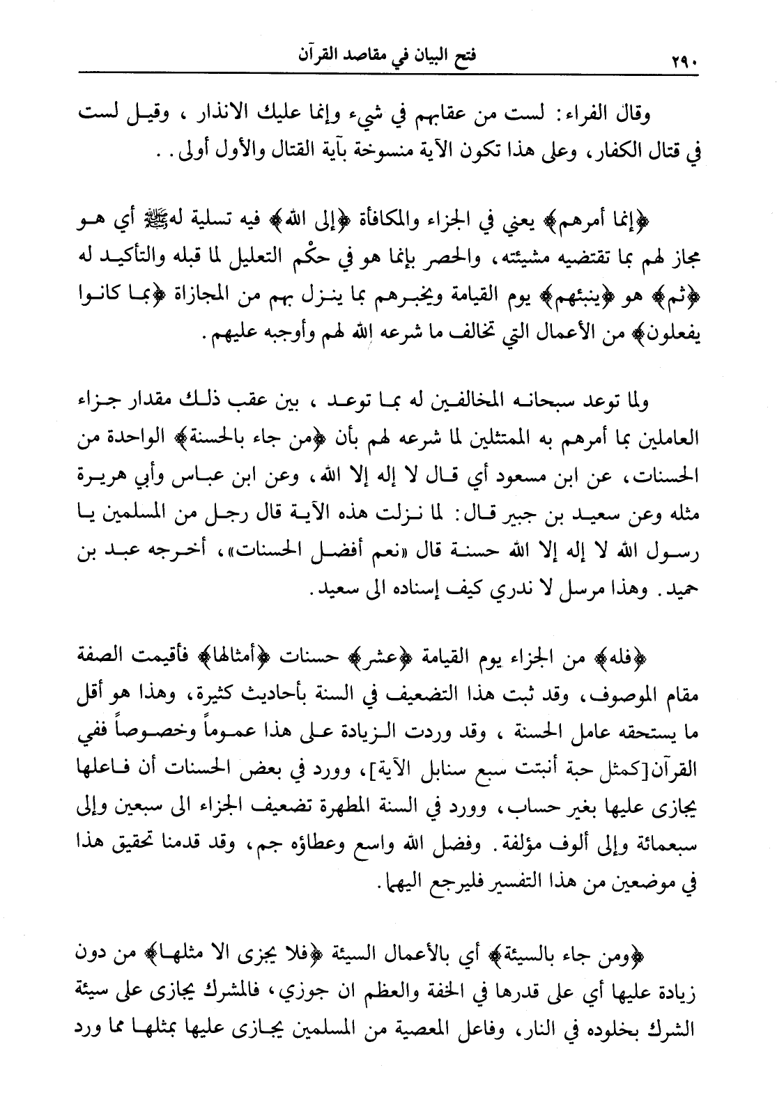 (من جاء بالحسنة) الواحدة من الحسنات، عن ابن مسعود أي قال لا إله إلا الله، وعن ابن عباس وأبي هريرة مثله وعن سعيد بن جبير قال: لا نزلت هذه الآية قال رجل من المسلمين يا رسول الله لا إله إلا الله حسنة قال " نعم أفضل الحسنات "، أخرجه عبد بن حميد. وهذا مرسل لا ندري كيف إسناده إلى سعيد.