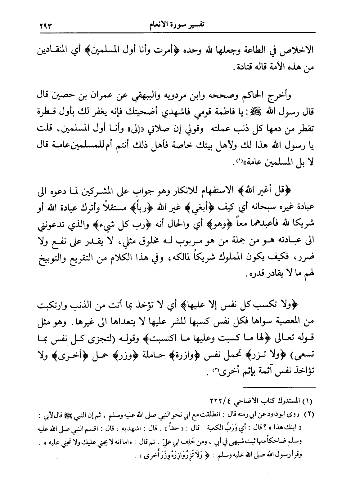 وأخرج الحاكم وصححه وابن مردويه والببهقي عن عمران بن حصين قال قال رسول الله - صلى الله عليه وسلم -: يا فاطمة قومي فاشهدي أضحيتك فإنه يغفر لك بأول قطرة تقطر من دمها كل ذنب عملته وقولي إن صلاتي " إلى " وأنا أول المسلمين، قلت يا رسول الله هذا لك ولأهل بيتك خاصة فأهل ذلك أنتم أم للمسلمين عامة قال لا بل المسلمين عامة " (¬1).