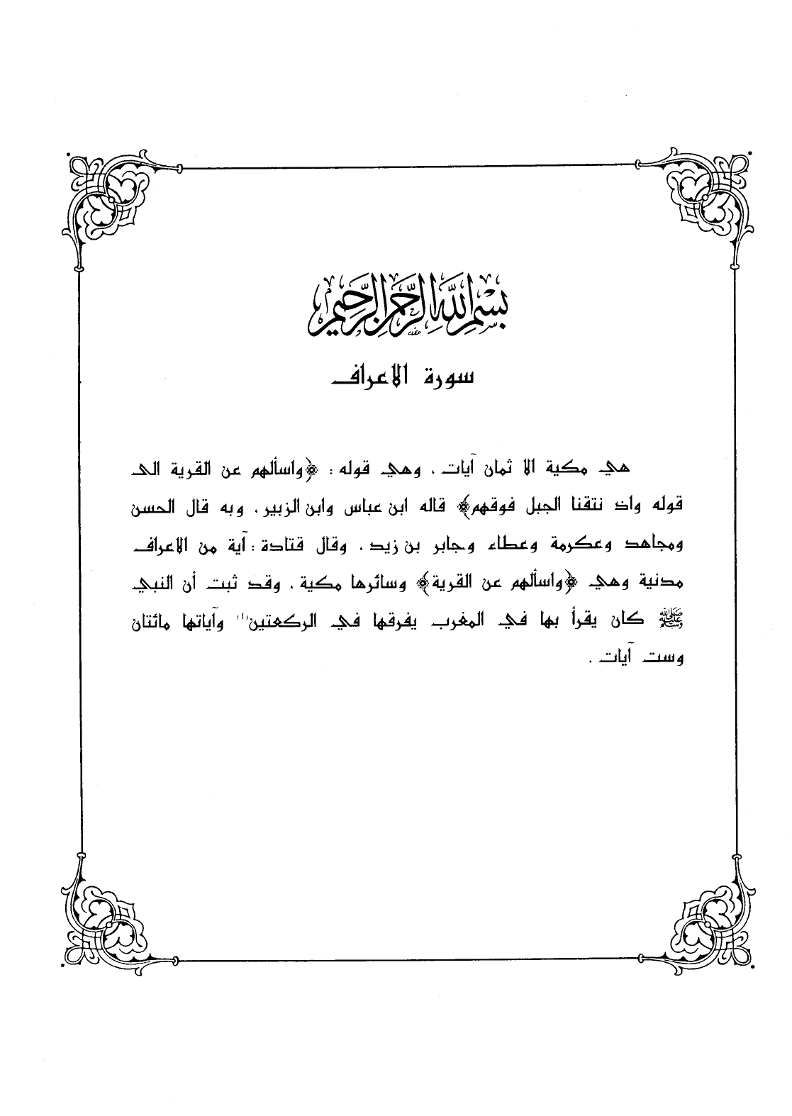 هي مكية إلا ثمان آيات، وهي قوله: (واسألهم عن القرية إلى قوله وإذ نتقنا الجبل فوقهم) قاله ابن عباس وابن الزبير، وبه قال الحسن ومجاهد وعكرمة وعطاء وجابر بن زيد، وقال قتادة: آية من الأعراف مدنية وهي (واسألهم عن القرية) وسائرها مكية، وقد ثبت أن النبي - صلى الله عليه وسلم - كان يقرأ بها في المغرب يفرقها في الركعتين وآياتها مائتان وست آيات.
