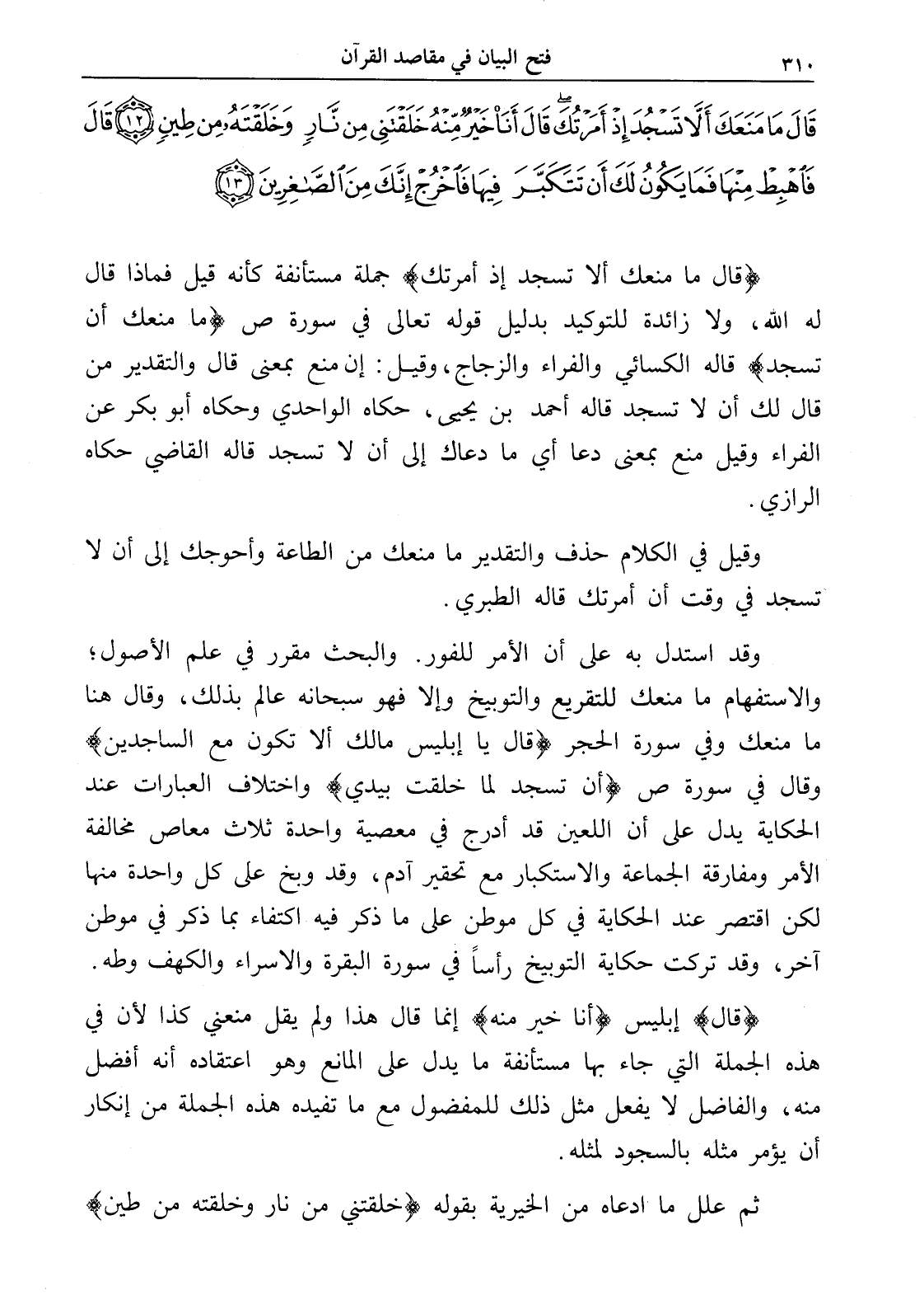 قَالَ مَا مَنَعَكَ أَلَّا تَسْجُدَ إِذْ أَمَرْتُكَ قَالَ أَنَا خَيْرٌ مِنْهُ خَلَقْتَنِي مِنْ نَارٍ وَخَلَقْتَهُ مِنْ طِينٍ (12) قَالَ فَاهْبِطْ مِنْهَا فَمَا يَكُونُ لَكَ أَنْ تَتَكَبَّرَ فِيهَا فَاخْرُجْ إِنَّكَ مِنَ الصَّاغِرِينَ (13)