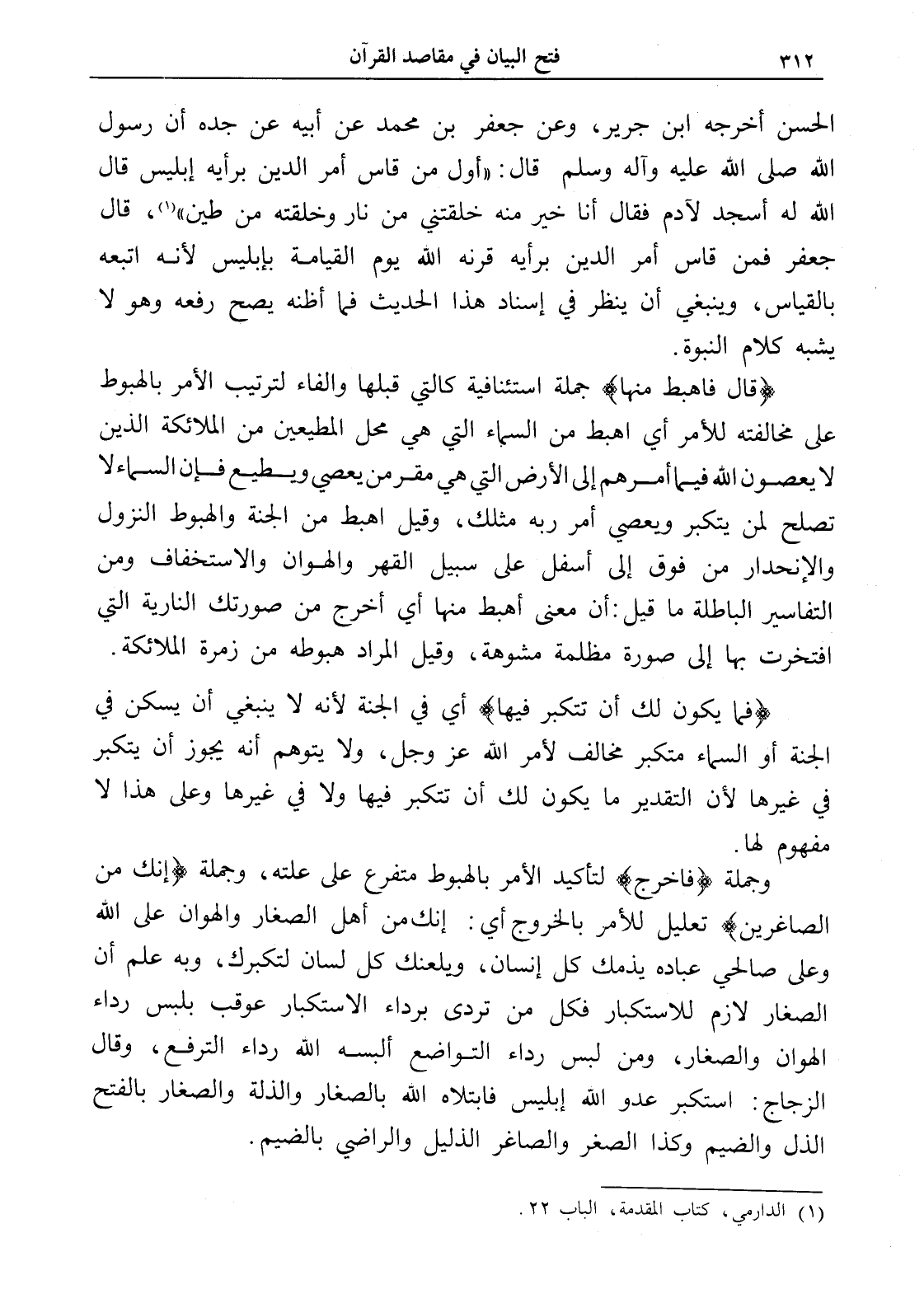 الحسن أخرجه ابن جرير، وعن جعفر بن محمد عن أبيه عن جده أن رسول الله صلى الله عليه وآله وسلم قال: " أول من قاس أمر الدين برأيه إبليس قال الله له أسجد لآدم فقال أنا خير منه خلقتني من نار وخلقته من طين " (¬1)، قال جعفر فمن قاس أمر الدين برأيه قرنه الله يوم القيامة بإبليس لأنه اتبعه بالقياس، وينبغي أن ينظر في إسناد هذا الحديث فما أظنه يصح رفعه وهو لا يشبه كلام النبوة.