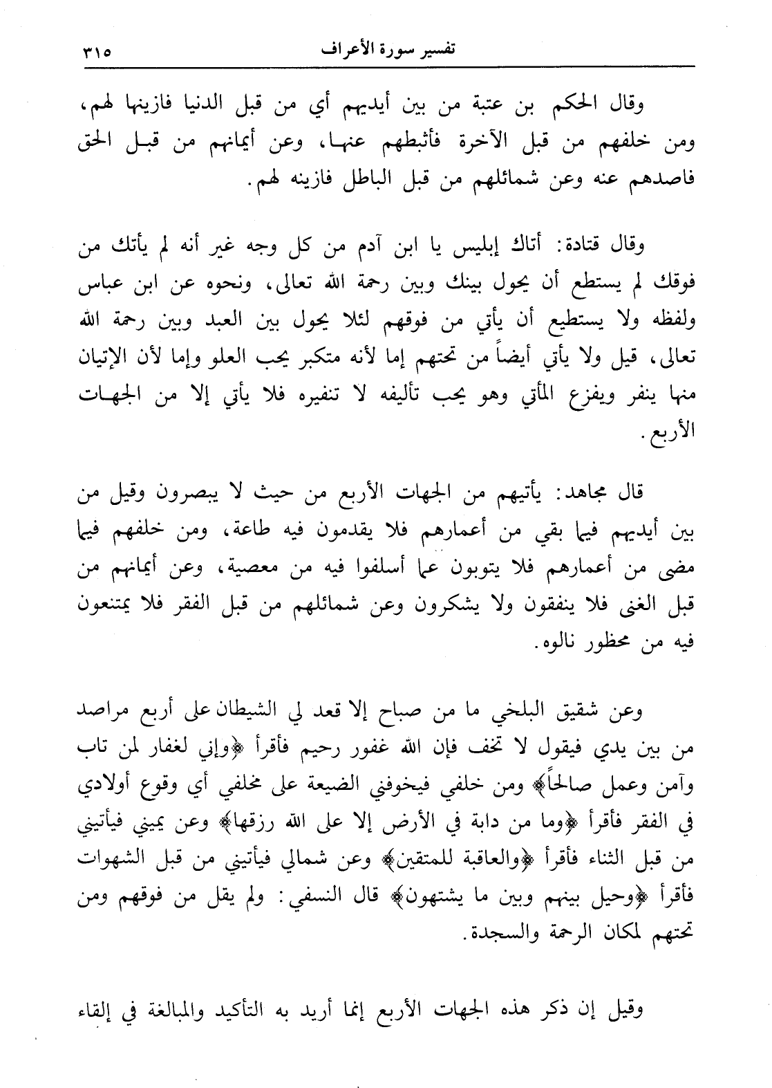 وقال قتادة: أتاك إبليس يا ابن آدم من كل وجه غير أنه لم يأتك من فوقك لم يستطع أن يحول بينك وبين رحمة الله تعالى، ونحوه عن ابن عباس ولفظه ولا يستطيع أن يأتي من فوقهم لئلا يحول بين العبد وبين رحمة الله تعالى، قيل ولا يأتي أيضاً من تحتهم إما لأنه متكبر يحب العلو وإما لأن الإتيان منها ينفر ويفزع المأتي وهو يحب تأليفه لا تنفيره فلا يأتي إلا من الجهات الأربع.