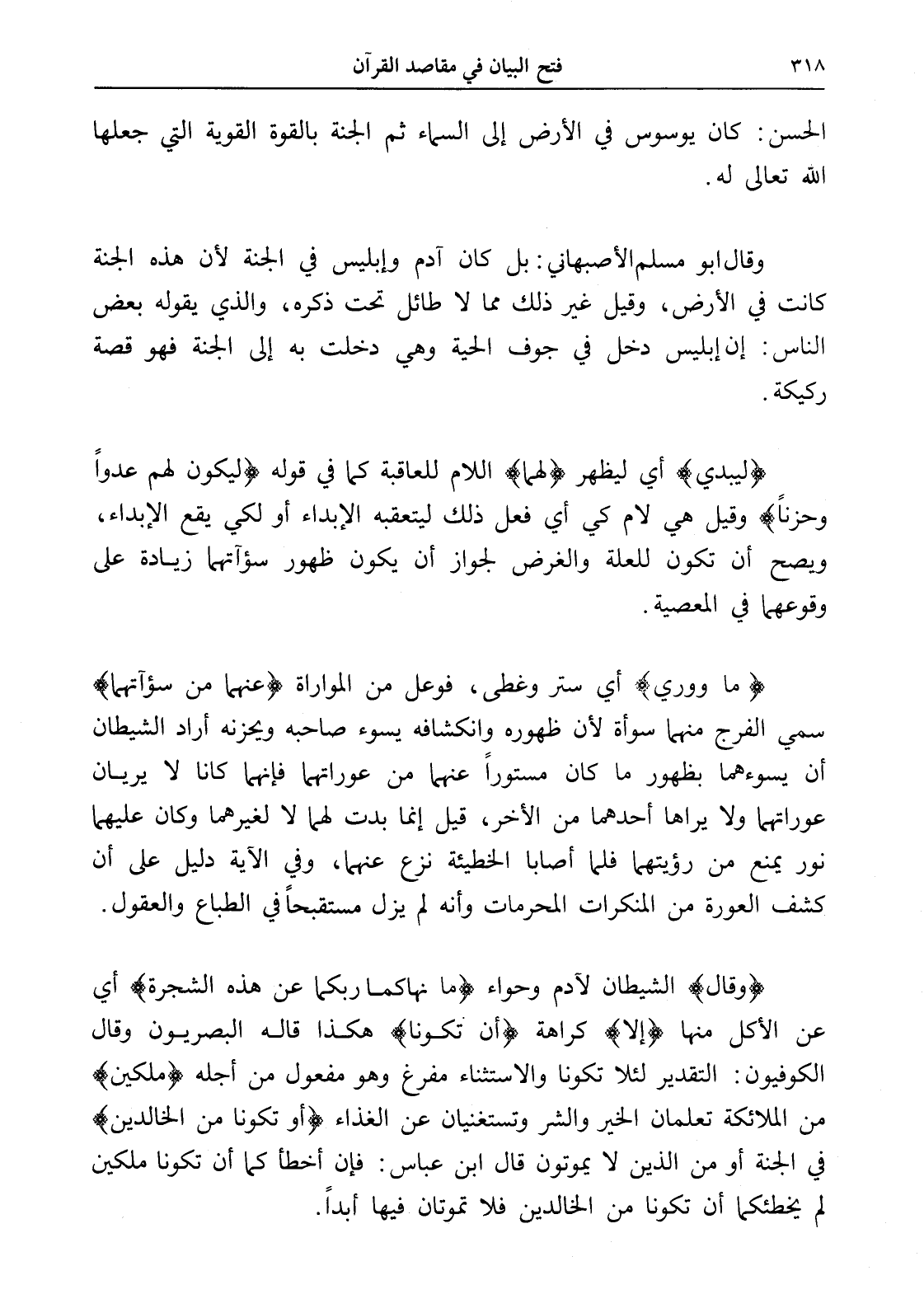 وقال أبو مسلم الأصبهاني: بل كان آدم وإبليس في الجنة لأن هذه الجنة كانت في الأرض، وقيل غير ذلك مما لا طائل تحت ذكره، والذي يقوله بعض الناس: إن إبليس دخل في جوف الحية وهي دخلت به إلى الجنة فهو قصة ركيكة.