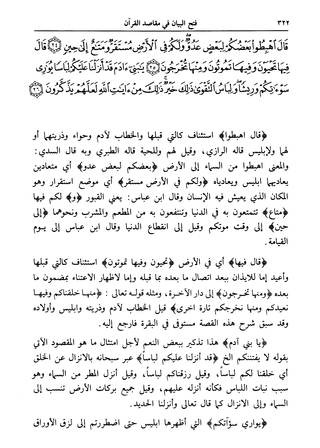 قَالَ اهْبِطُوا بَعْضُكُمْ لِبَعْضٍ عَدُوٌّ وَلَكُمْ فِي الْأَرْضِ مُسْتَقَرٌّ وَمَتَاعٌ إِلَى حِينٍ (24) قَالَ فِيهَا تَحْيَوْنَ وَفِيهَا تَمُوتُونَ وَمِنْهَا تُخْرَجُونَ (25) يَا بَنِي آدَمَ قَدْ أَنْزَلْنَا عَلَيْكُمْ لِبَاسًا يُوَارِي سَوْآتِكُمْ وَرِيشًا وَلِبَاسُ التَّقْوَى ذَلِكَ خَيْرٌ ذَلِكَ مِنْ آيَاتِ اللَّهِ لَعَلَّهُمْ يَذَّكَّرُونَ (26)