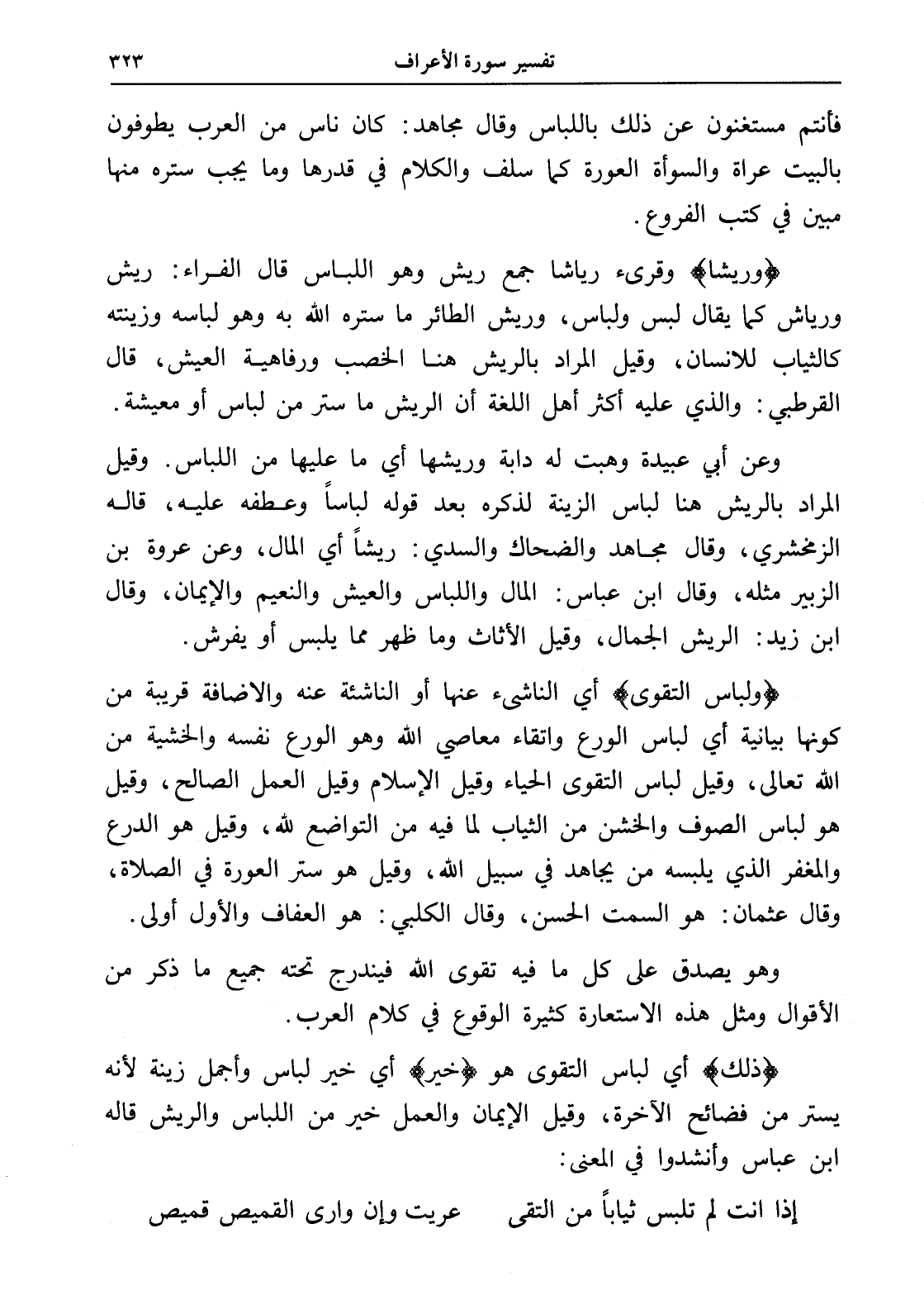 (وريشا) وقرئ رياشا جمع ريش وهو اللباس قال الفراء: ريش ورياش كما يقال لبس ولباس، وريش الطائر ما ستره الله به وهو لباسه وزينته كالثياب للإنسان، وقيل المراد بالريش هنا الخصب ورفاهية العيش، قال القرطبي: والذي عليه أكثر أهل اللغة أن الريش ما ستر من لباس أو معيشة.
