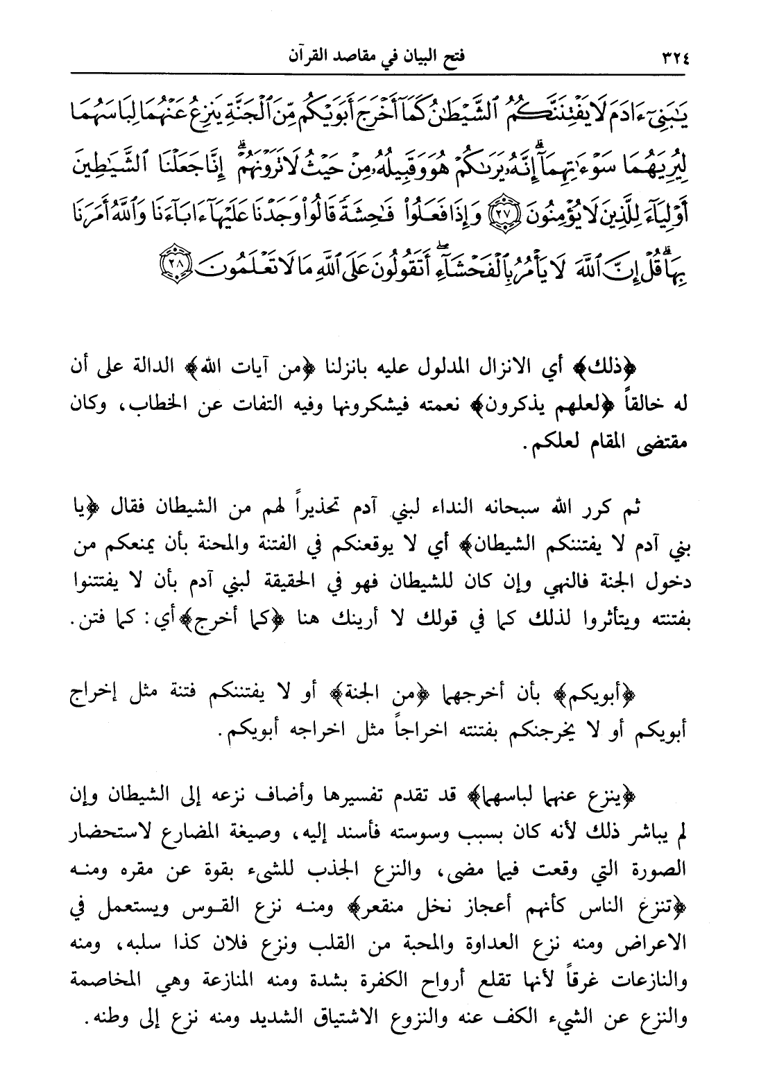 يَا بَنِي آدَمَ لَا يَفْتِنَنَّكُمُ الشَّيْطَانُ كَمَا أَخْرَجَ أَبَوَيْكُمْ مِنَ الْجَنَّةِ يَنْزِعُ عَنْهُمَا لِبَاسَهُمَا لِيُرِيَهُمَا سَوْآتِهِمَا إِنَّهُ يَرَاكُمْ هُوَ وَقَبِيلُهُ مِنْ حَيْثُ لَا تَرَوْنَهُمْ إِنَّا جَعَلْنَا الشَّيَاطِينَ أَوْلِيَاءَ لِلَّذِينَ لَا يُؤْمِنُونَ (27) وَإِذَا فَعَلُوا فَاحِشَةً قَالُوا وَجَدْنَا عَلَيْهَا آبَاءَنَا وَاللَّهُ أَمَرَنَا بِهَا قُلْ إِنَّ اللَّهَ لَا يَأْمُرُ بِالْفَحْشَاءِ أَتَقُولُونَ عَلَى اللَّهِ مَا لَا تَعْلَمُونَ (28)