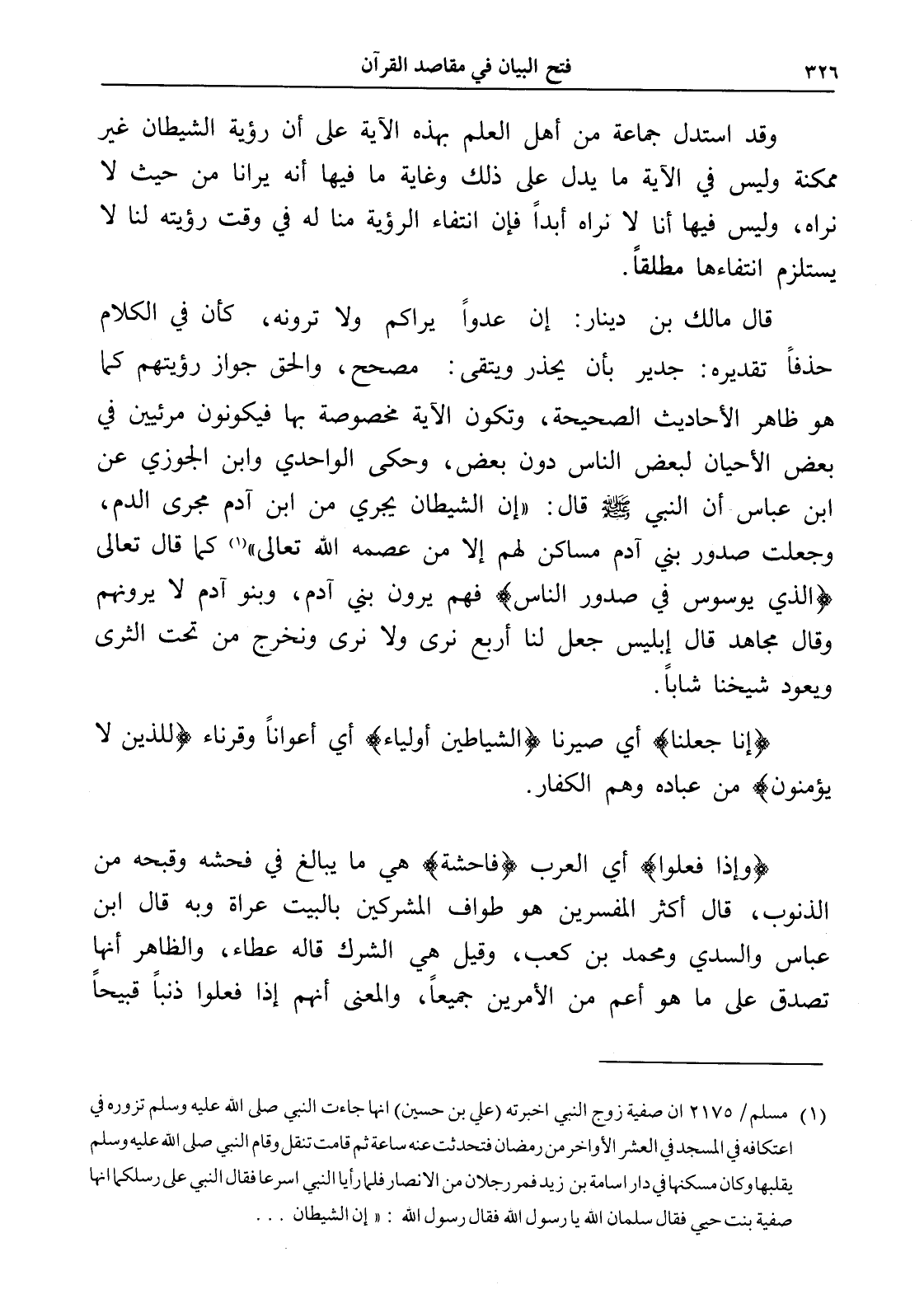 (¬1) مسلم/2175 أن صفية زوج النبي أخبرته (علي بن حسين) أنها جاءت النبي صلى الله عليه وسلم تزوره في اعتكافه في المسجد في العشر الأواخر من رمضان فتحدثت عنه ساعة ثم قامت تنقل وقام النبي صلى الله عليه وسلم يقلبها وكان مسكنها في دار أسامة بن زيد فمر رجلان من الأنصار فلما رأيا النبي أسرعا فقال النبي على رسلكما إنها صفية بنت حي فقال سلمان الله يا رسول الله فقال رسول الله: " إن الشيطان ...