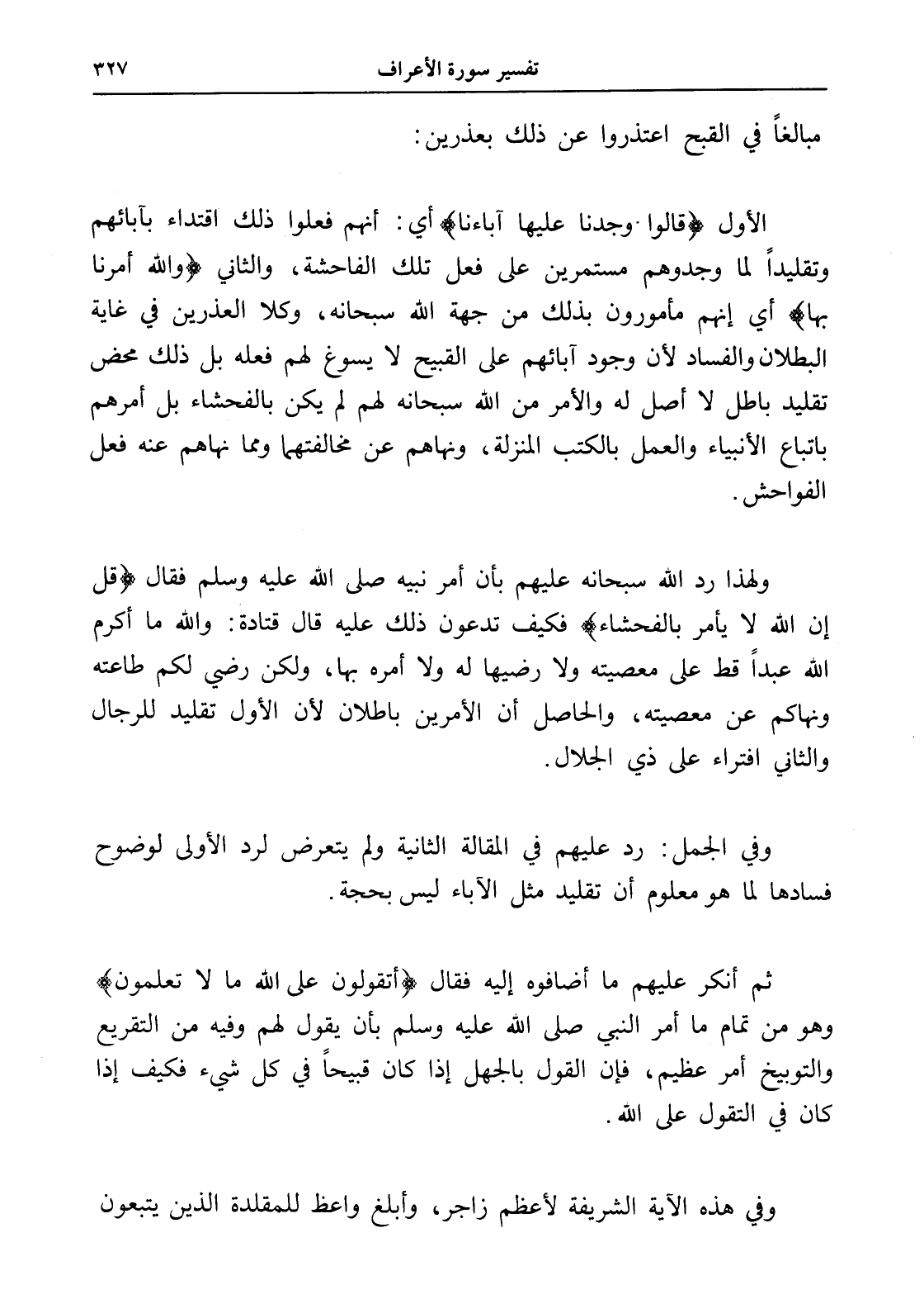 ولهذا رد الله سبحانه عليهم بأن أمر نبيه صلى الله عليه وسلم فقال (قل إن الله لا يأمر بالفحشاء) فكيف تدعون ذلك عليه قال قتادة: والله ما أكرم الله عبداً قط على معصيته ولا رضيها له ولا أمره بها، ولكن رضي لكم طاعته ونهاكم عن معصيته، والحاصل أن الأمرين باطلان لأن الأول تقليد للرجال والثاني افتراء على ذي الجلال.
