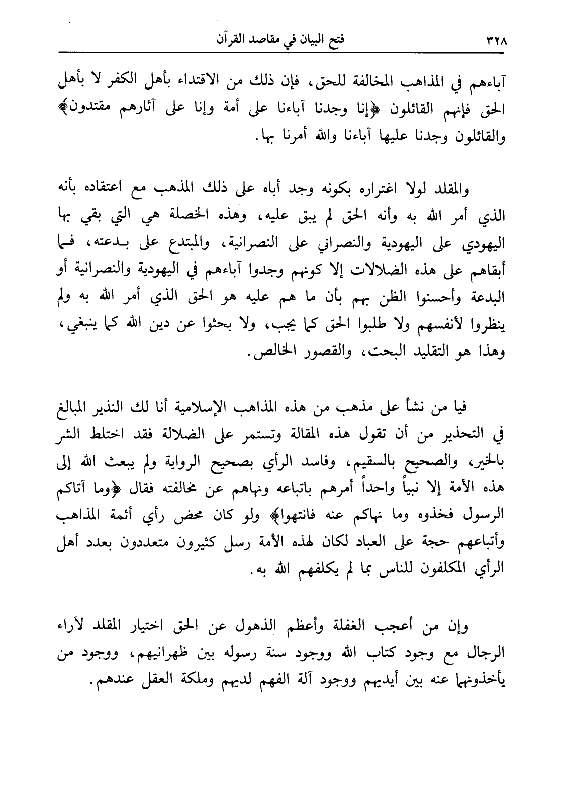 والمقلد لولا اغتراره بكونه وجد أباه على ذلك المذهب مع اعتقاده بأنه الذي أمر الله به وأنه الحق لم يبق عليه، وهذه الخصلة هي التي بقي بها اليهودي على اليهودية والنصراني على النصرانية، والمبتدع على بدعته، فما أبقاهم على هذه الضلالات إلا كونهم وجدوا آباءهم في اليهودية والنصرانية أو البدعة وأحسنوا الظن بهم بأن ما هم عليه هو الحق الذي أمر الله به ولم ينظروا لأنفسهم ولا طلبوا الحق كما يجب، ولا بحثوا عن دين الله كما ينبغي، وهذا هو التقليد البحت، والقصور الخالص.