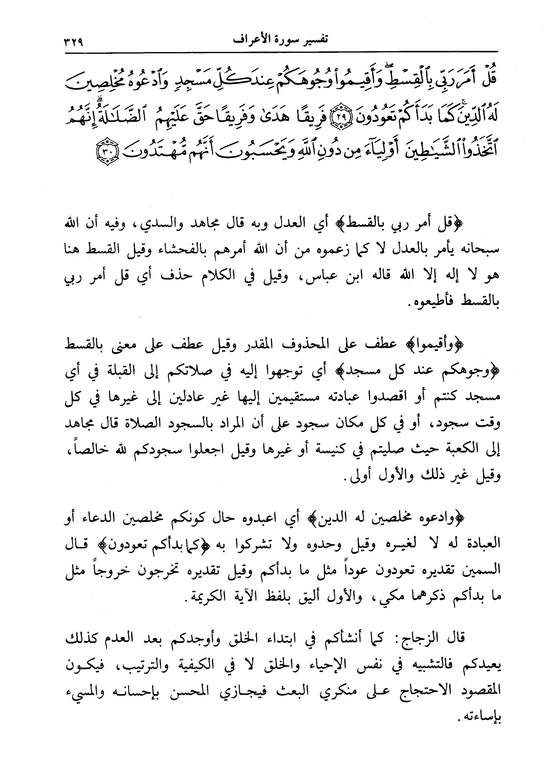قُلْ أَمَرَ رَبِّي بِالْقِسْطِ وَأَقِيمُوا وُجُوهَكُمْ عِنْدَ كُلِّ مَسْجِدٍ وَادْعُوهُ مُخْلِصِينَ لَهُ الدِّينَ كَمَا بَدَأَكُمْ تَعُودُونَ (29) فَرِيقًا هَدَى وَفَرِيقًا حَقَّ عَلَيْهِمُ الضَّلَالَةُ إِنَّهُمُ اتَّخَذُوا الشَّيَاطِينَ أَوْلِيَاءَ مِنْ دُونِ اللَّهِ وَيَحْسَبُونَ أَنَّهُمْ مُهْتَدُونَ (30)