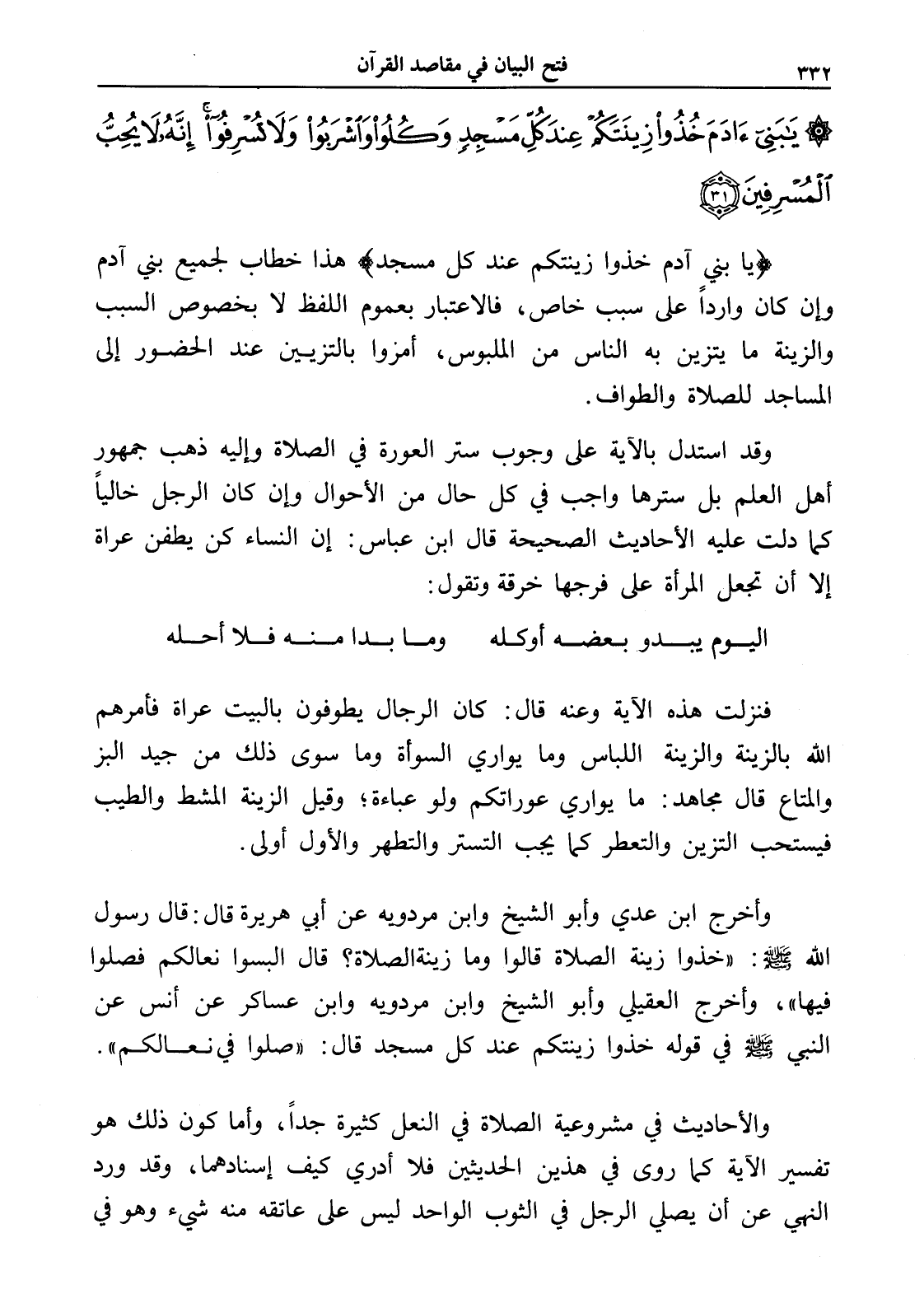 يَا بَنِي آدَمَ خُذُوا زِينَتَكُمْ عِنْدَ كُلِّ مَسْجِدٍ وَكُلُوا وَاشْرَبُوا وَلَا تُسْرِفُوا إِنَّهُ لَا يُحِبُّ الْمُسْرِفِينَ (31)