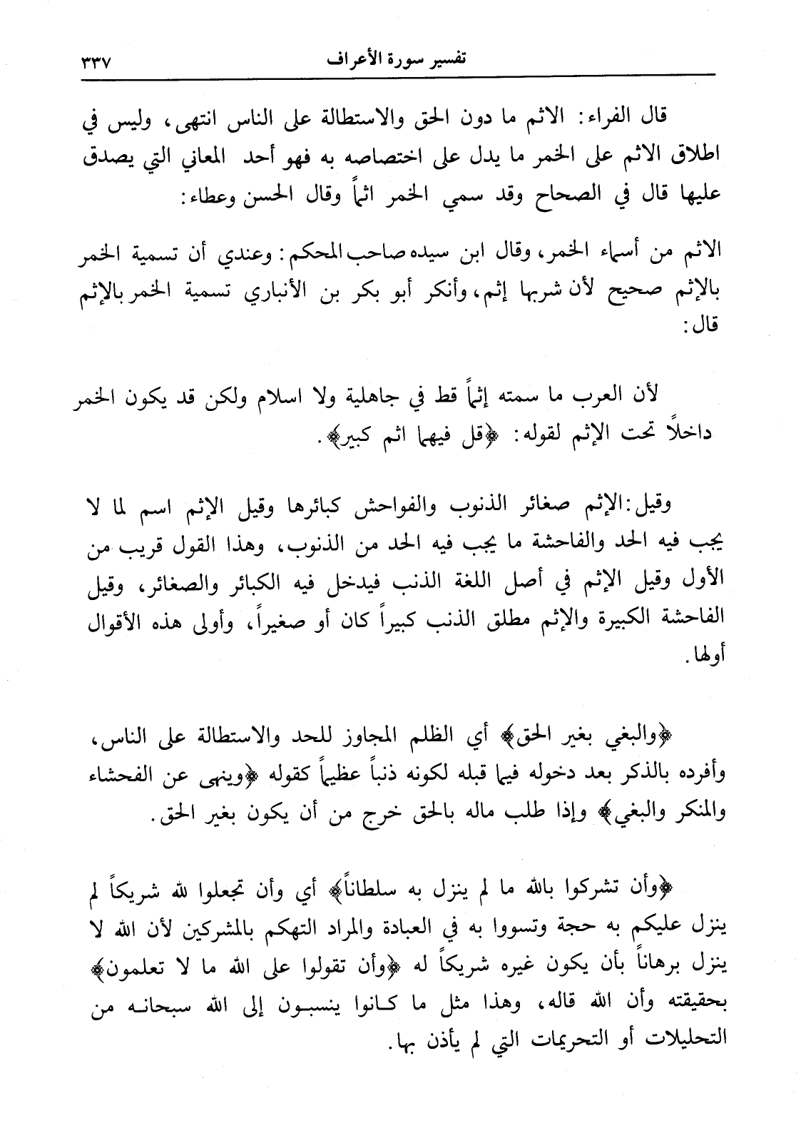 قال الفراء: الإثم ما دون الحق والاستطالة على الناس انتهى، وليس في إطلاق الإثم على الخمر ما يدل على اختصاصه به فهو أحد المعاني التي يصدق عليها قال في الصحاح وقد سمي الخمر إثماً وقال الحسن وعطاء: