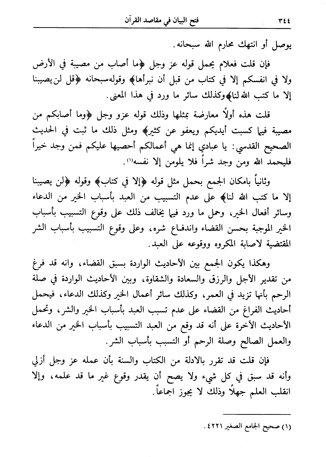 قلت هذه أولاً معارضة بمثلها وذلك قوله عزو وجل (وما أصابكم من مصيبة فيما كسبت أيديكم ويعفو عن كثير) ومثل ذلك ما ثبت في الحديث الصحيح القدسي: يا عبادي إنما هي أعمالكم أحصيها عليكم فمن وجد خيراً فليحمد الله ومن وجد شراً فلا يلومن إلا نفسه (¬1).