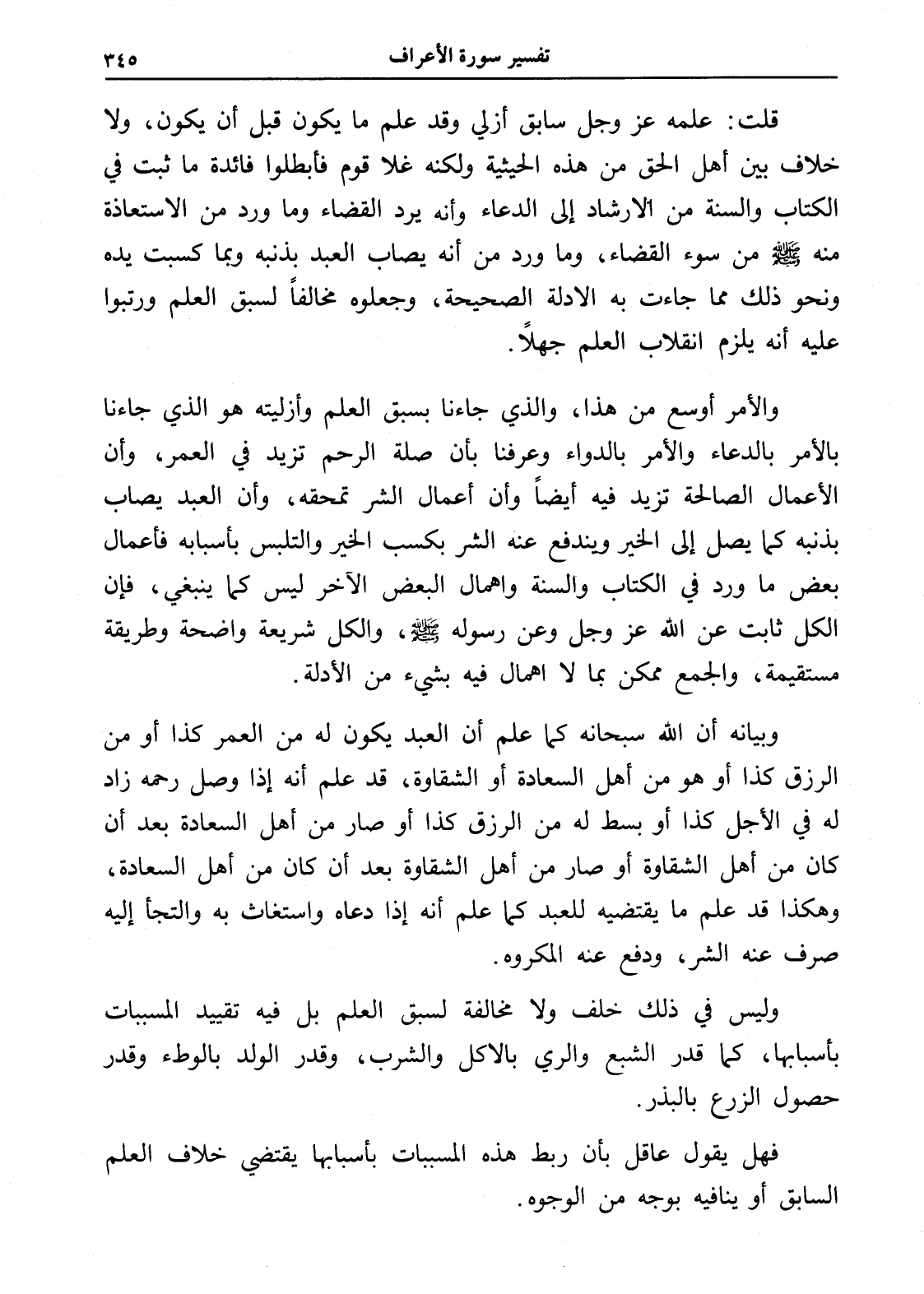 والأمر أوسع من هذا، والذي جاءنا بسبق العلم وأزليته هو الذي جاءنا بالأمر بالدعاء والأمر بالدواء وعرفنا بأن صلة الرحم تزيد في العمر، وأن الأعمال الصالحة تزيد فيه أيضاً وأن أعمال الشر تمحقه، وأن العبد يصاب بذنبه كما يصل إلى الخير ويندفع عنه الشر بكسب الخير والتلبس بأسبابه فأعمال بعض ما ورد في الكتاب والسنة وإهمال البعض الآخر ليس كما ينبغي، فإن الكل ثابت عن الله عز وجل وعن رسوله - صلى الله عليه وسلم -، والكل شريعة واضحة وطريقة مستقيمة، والجمع ممكن بما لا إهمال فيه بشيء من الأدلة.