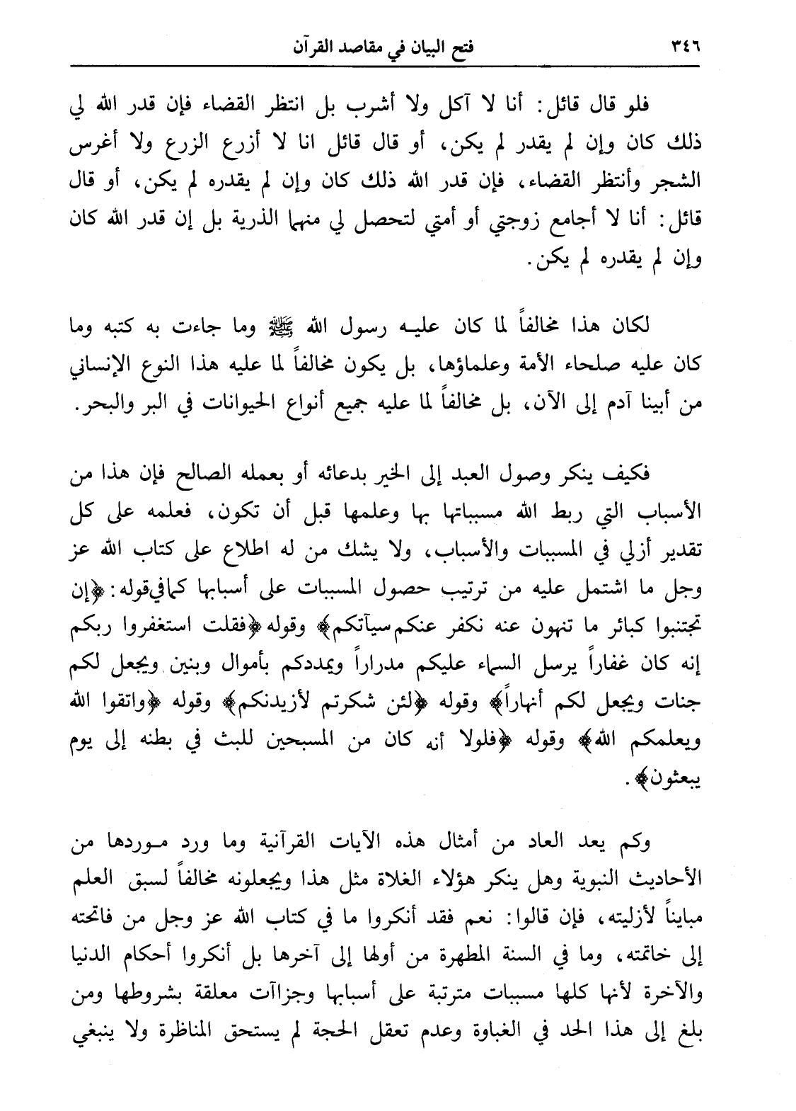 وكم يعد العاد من أمثال هذه الآيات القرآنية وما ورد موردها من الأحاديث النبوية وهل ينكر هؤلاء الغلاة مثل هذا ويجعلونه مخالفاً لسبق العلم مبايناً لأزليته، فإن قالوا: نعم فقد أنكروا ما في كتاب الله عز وجل من فاتحته إلى خاتمته، وما في السنة المطهرة من أولها إلى آخرها بل أنكروا أحكام الدنيا والآخرة لأنها كلها مسببات مترتبة على أسبابها وجزاآت معلقة بشروطها ومن بلغ إلى هذا الحد في الغباوة وعدم تعقل الحجة لم يستحق المناظرة ولا ينبغي