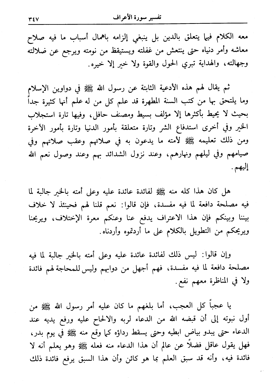 يا عجباً كل العجب، أما بلغهم ما كان عليه أمر رسول الله - صلى الله عليه وسلم - من أول نبوته إلى أن قبضه الله من الدعاء لربه والإلحاح عليه ورفع يديه عند الدعاء حتى يبدو بياض إبطيه وحتى يسقط رداؤه كما وقع منه - صلى الله عليه وسلم - في يوم بدر، فهل يقول عاقل فضلاً عن عالم أن هذا الدعاء منه فعله - صلى الله عليه وسلم - وهو يعلم أنه لا فائدة فيه، وأنه قد سبق العلم بما هو كائن وأن هذا السبق يرفع فائدة ذلك