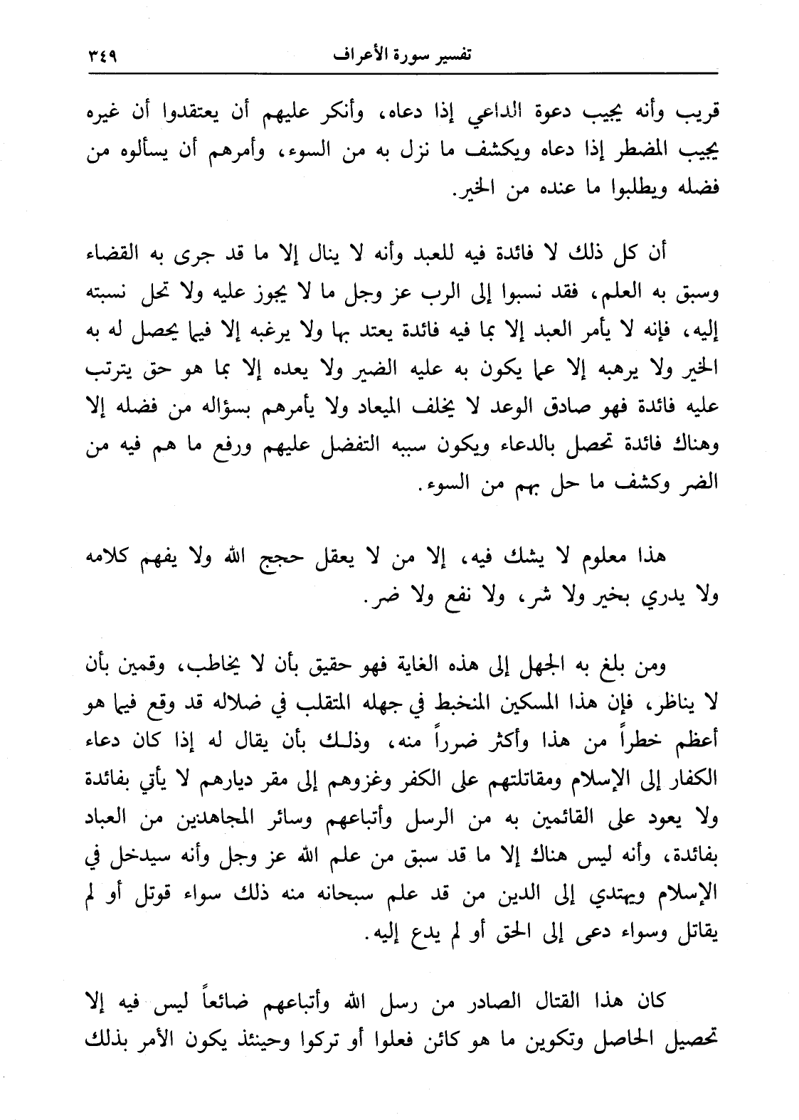 ومن بلغ به الجهل إلى هذه الغاية فهو حقيق بأن لا يخاطب، وقمين بأن لا يناظر، فإن هذا المسكين المنخبط في جهله المتقلب في ضلاله قد وقع فيما هو أعظم خطراً من هذا وأكثر ضرراً منه، وذلك بأن يقال له إذا كان دعاء الكفار إلى الإسلام ومقاتلتهم على الكفر وغزوهم إلى مقر ديارهم لا يأتي بفائدة ولا يعود على القائمين به من الرسل وأتباعهم وسائر المجاهدين من العباد بفائدة، وأنه ليس هناك إلا ما قد سبق من علم الله عز وجل وأنه سيدخل في الإسلام ويهتدي إلى الدين من قد علم سبحانه منه ذلك سواء قوتل أو لم يقاتل وسواء دعى إلى الحق أو لم يدع إليه.