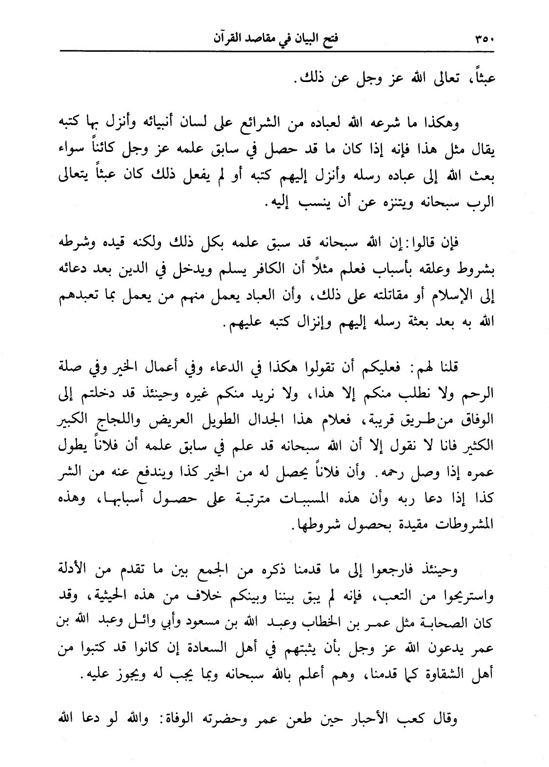 وهكذا ما شرعه الله لعباده من الشرائع على لسان أنبيائه وأنزل بها كتبه يقال مثل هذا فإنه إذا كان ما قد حصل في سابق علمه عز وجل كائناً سواء بعث الله إلى عباده رسله وأنزل إليهم كتبه أو لم يفعل ذلك كان عبثاً يتعالى الرب سبحانه ويتنزه عن أن ينسب إليه.